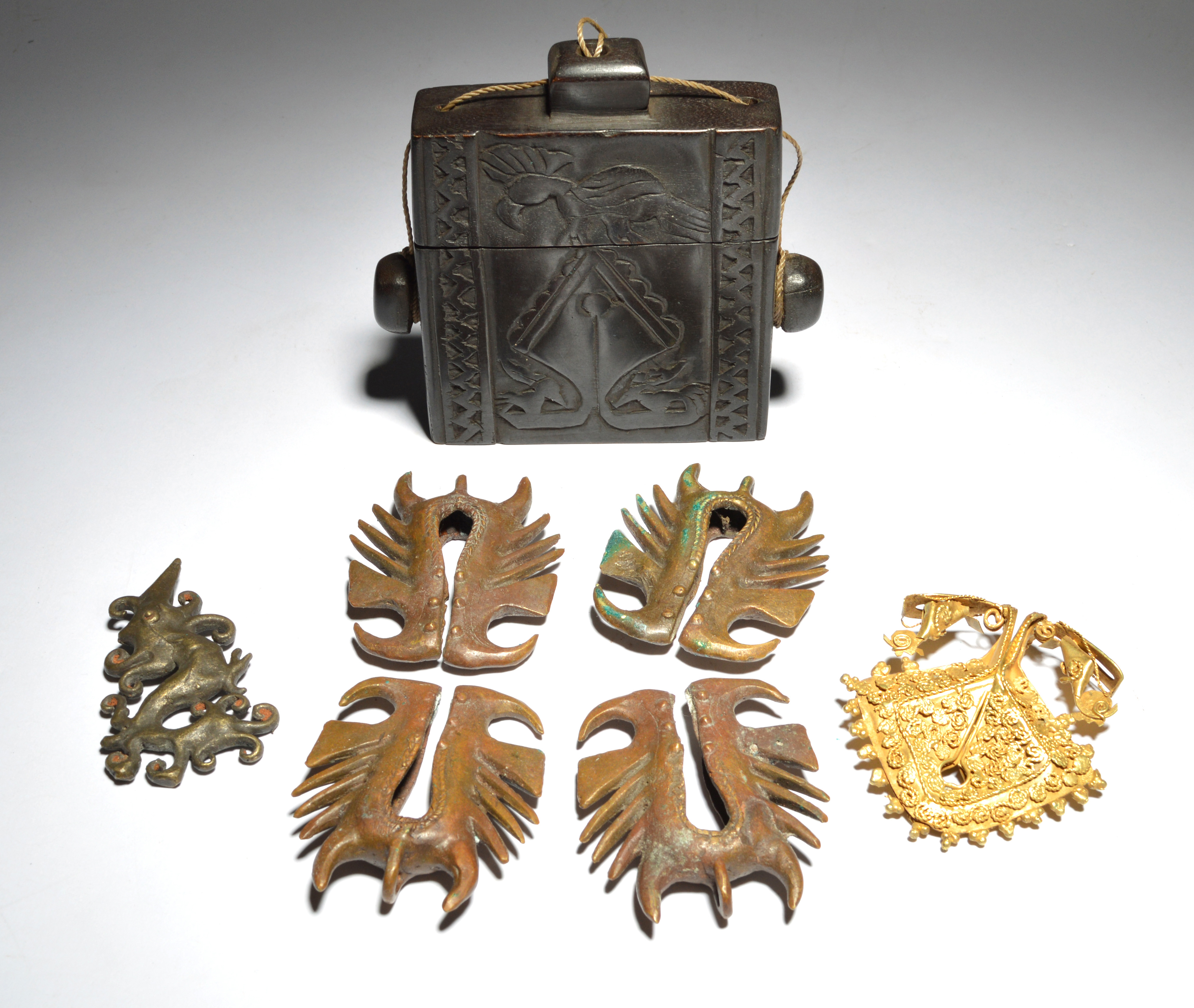 four bronze mamulis, and Aso dragon bronze ear ornament and a Sumba box and cover, with carved mamuli, a bird, a turtle and a stag. (6)