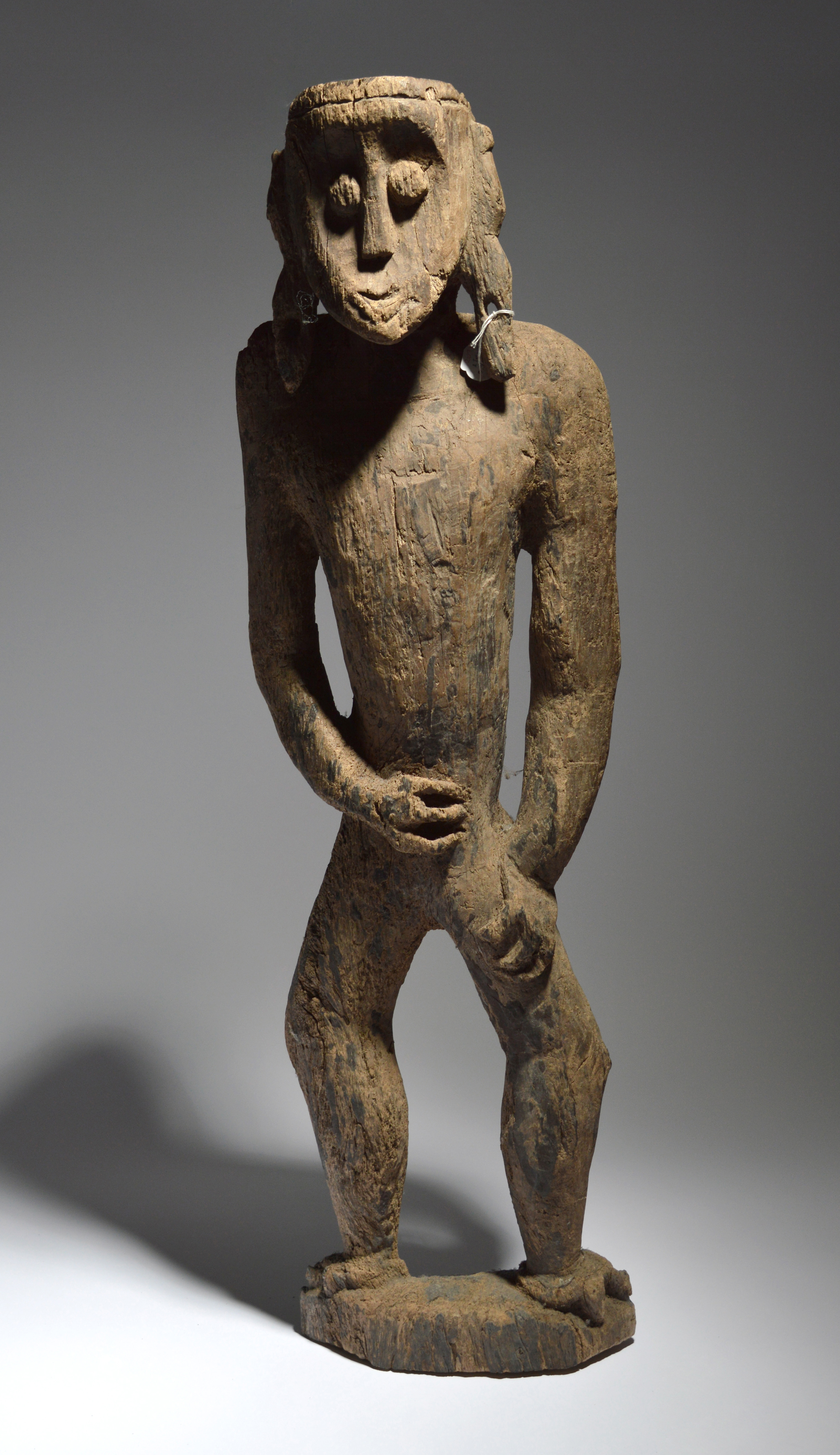 standing, with long ear lobes and with hands on the abdomen and thigh,