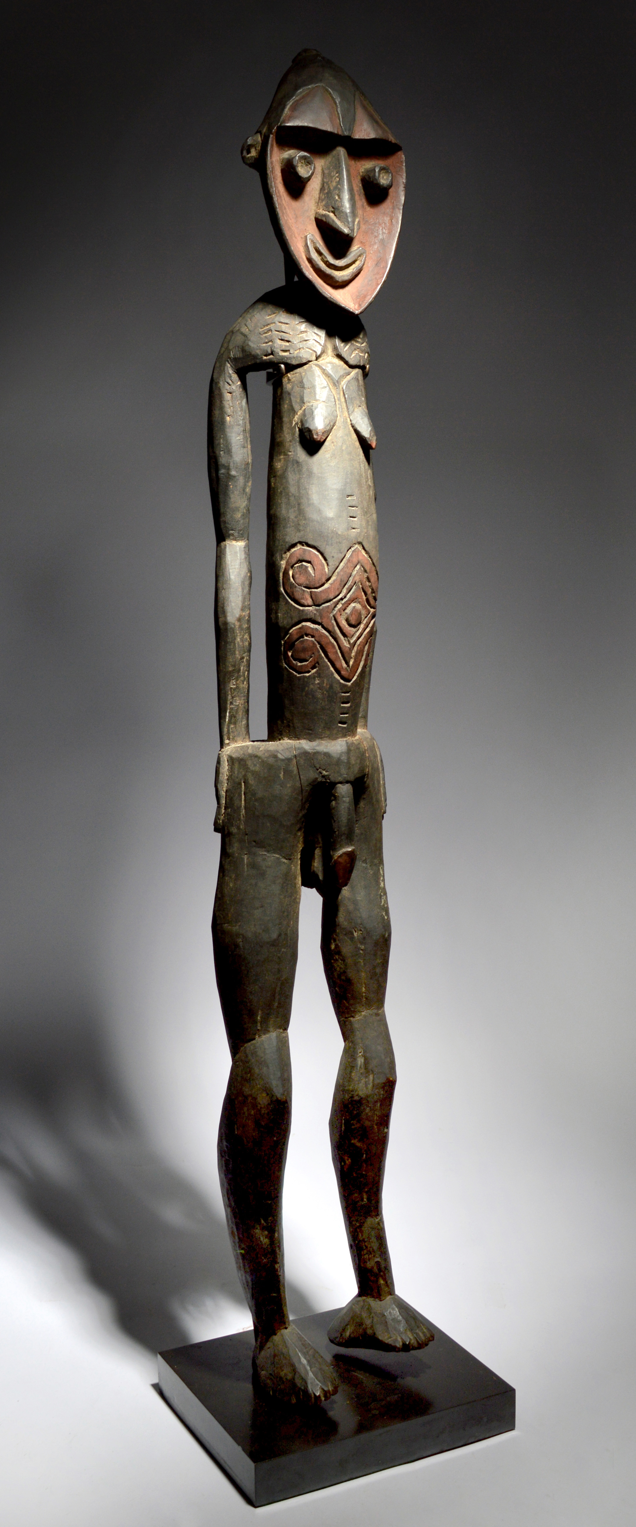 with a pony tail, pierced ears and body scarifications, with black and red pigment,