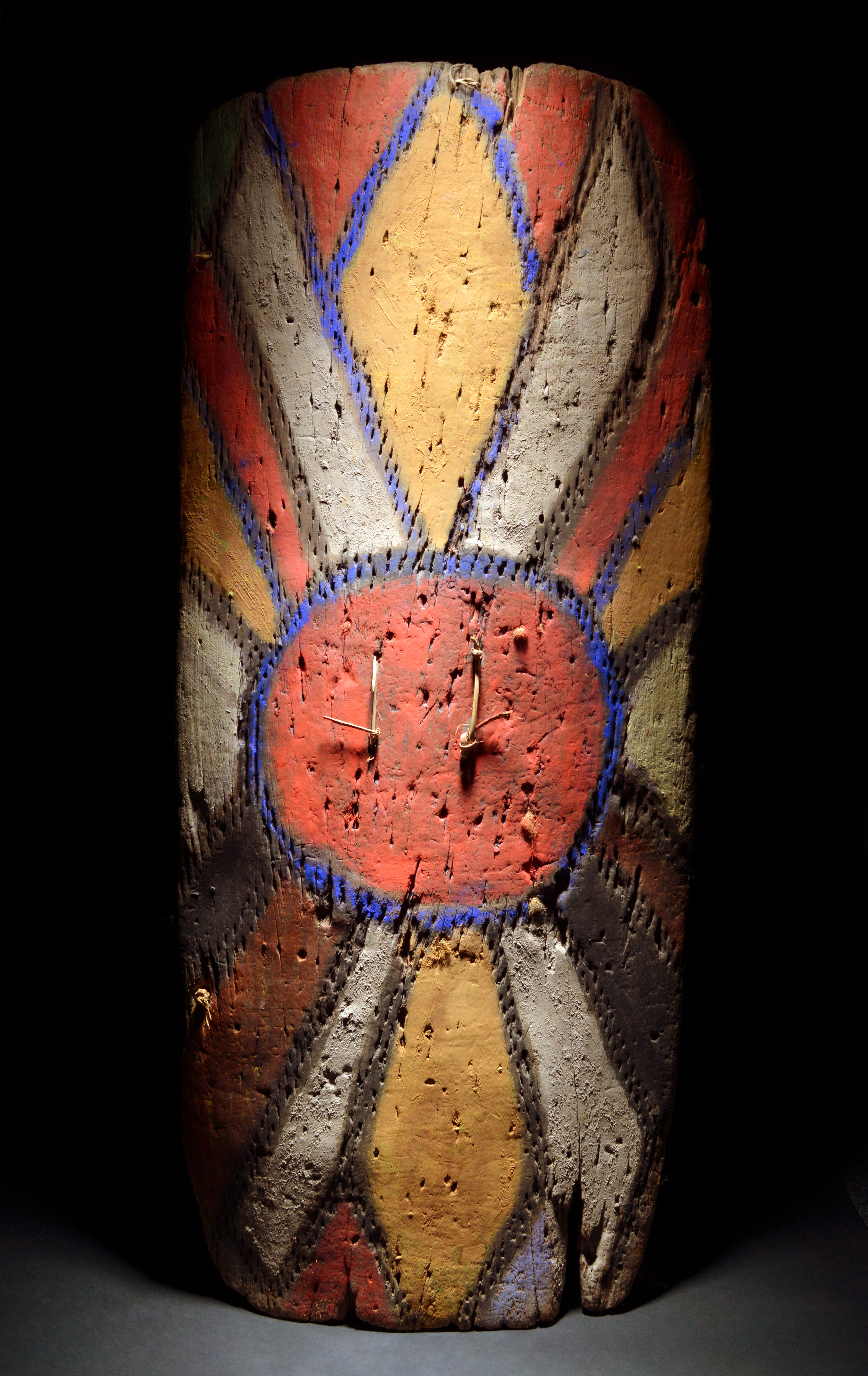 A Western Highlands war shield Papua New Guinea with notched outline and bright pigment decoration