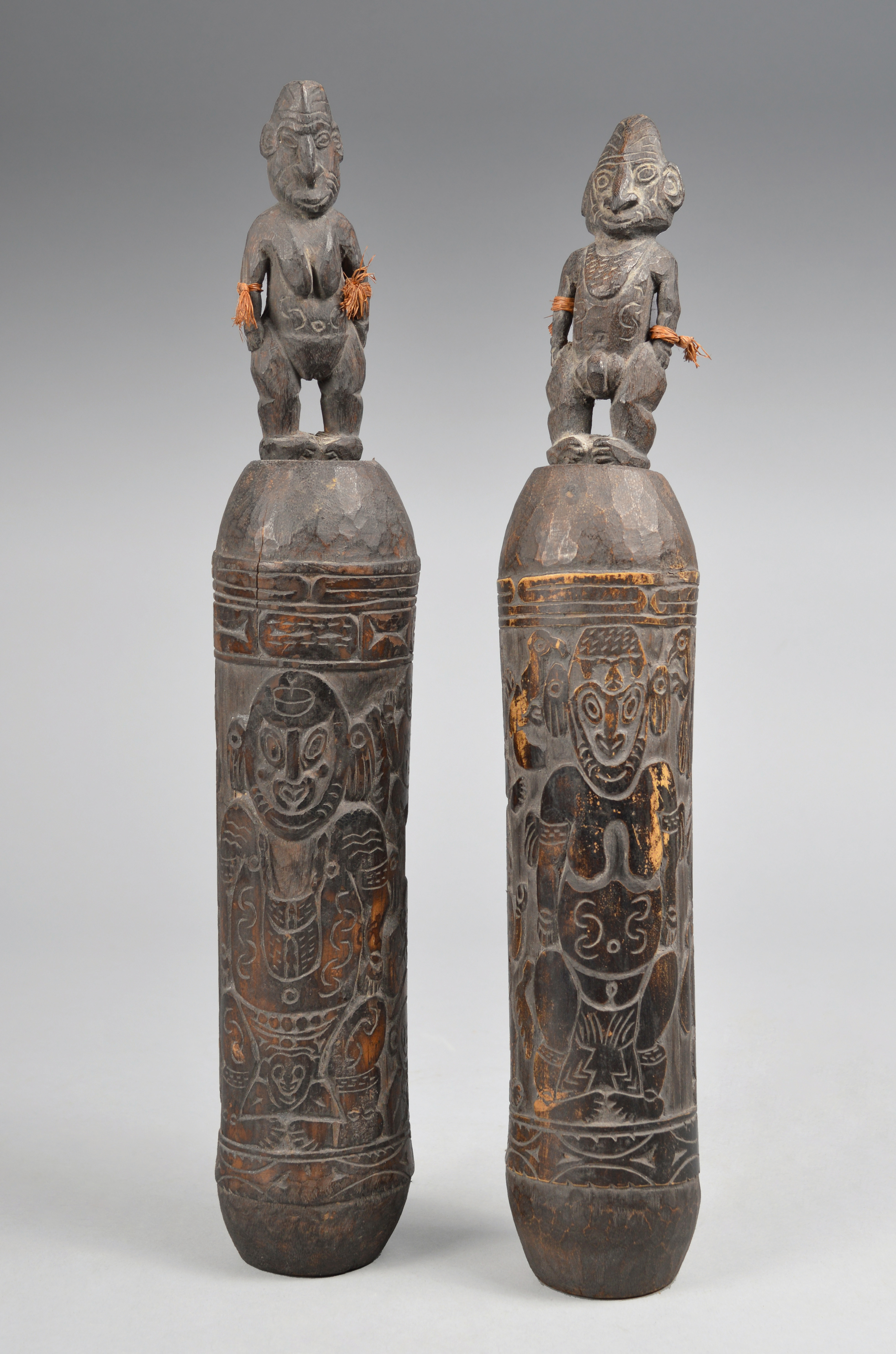 bamboo with carved ancestor figures, with male and female terminal spatulas,