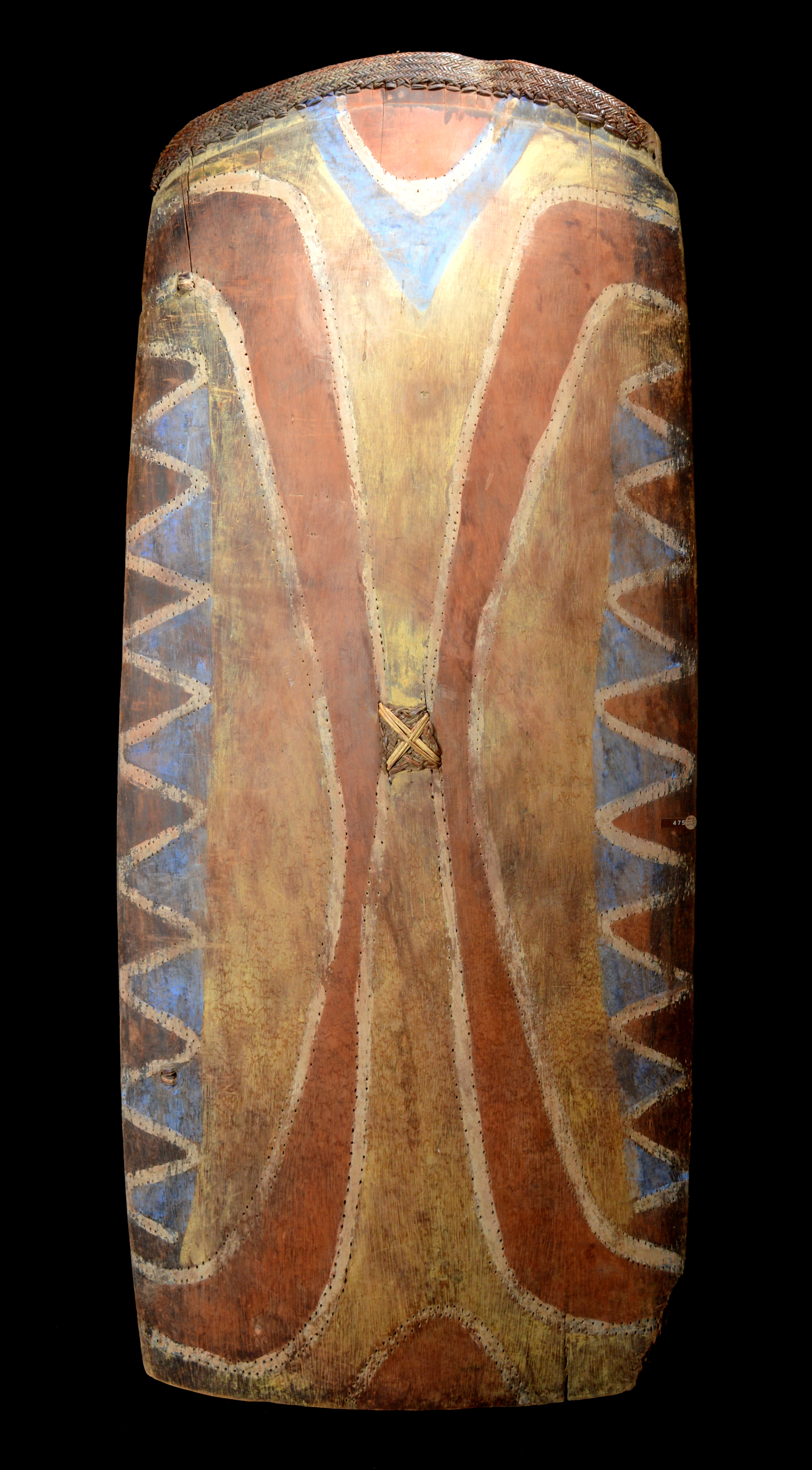 rectangular with an arched top and woven fibre covering, the body with punched dot outlines and with polychrome decoration, with a fibre handle, the back with numerous scratches including hand outlines, inventory number 475,