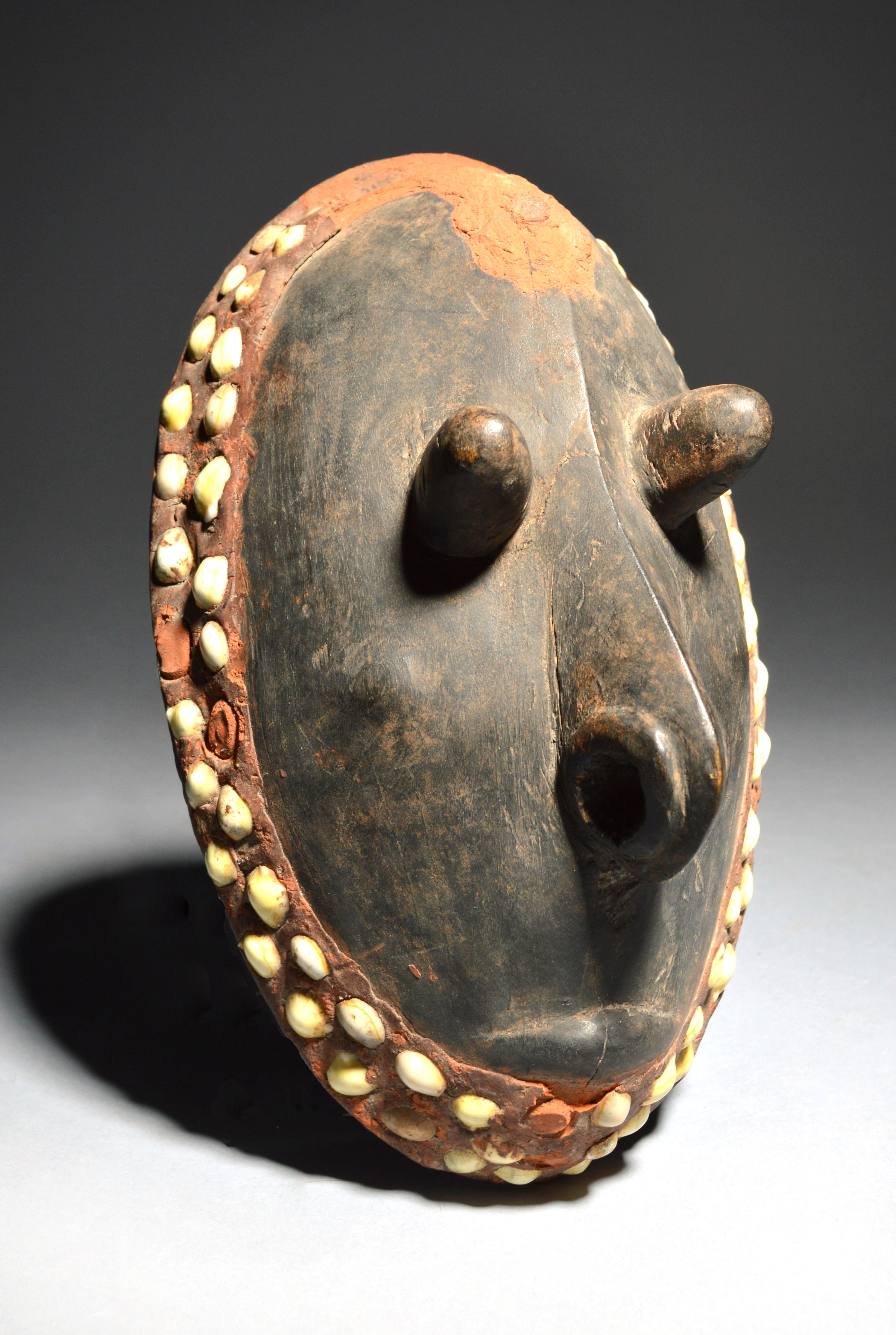 with protruding eyes and pierced nose, with a red paste border inset cowrie shells,