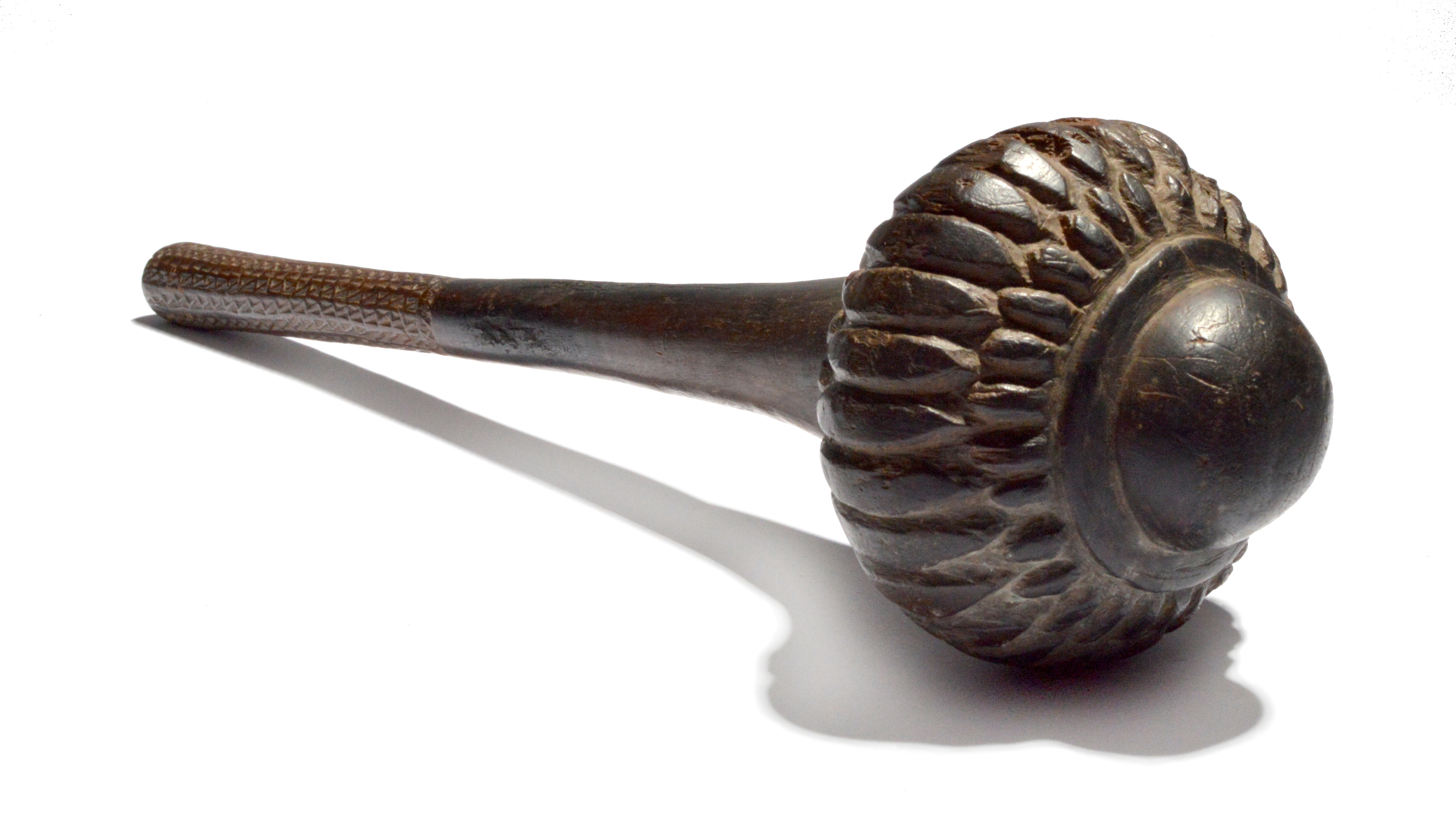 A Fiji throwing club i ula tavatava Melanesia with a ribbed head and a carved zig-zag grip with a...