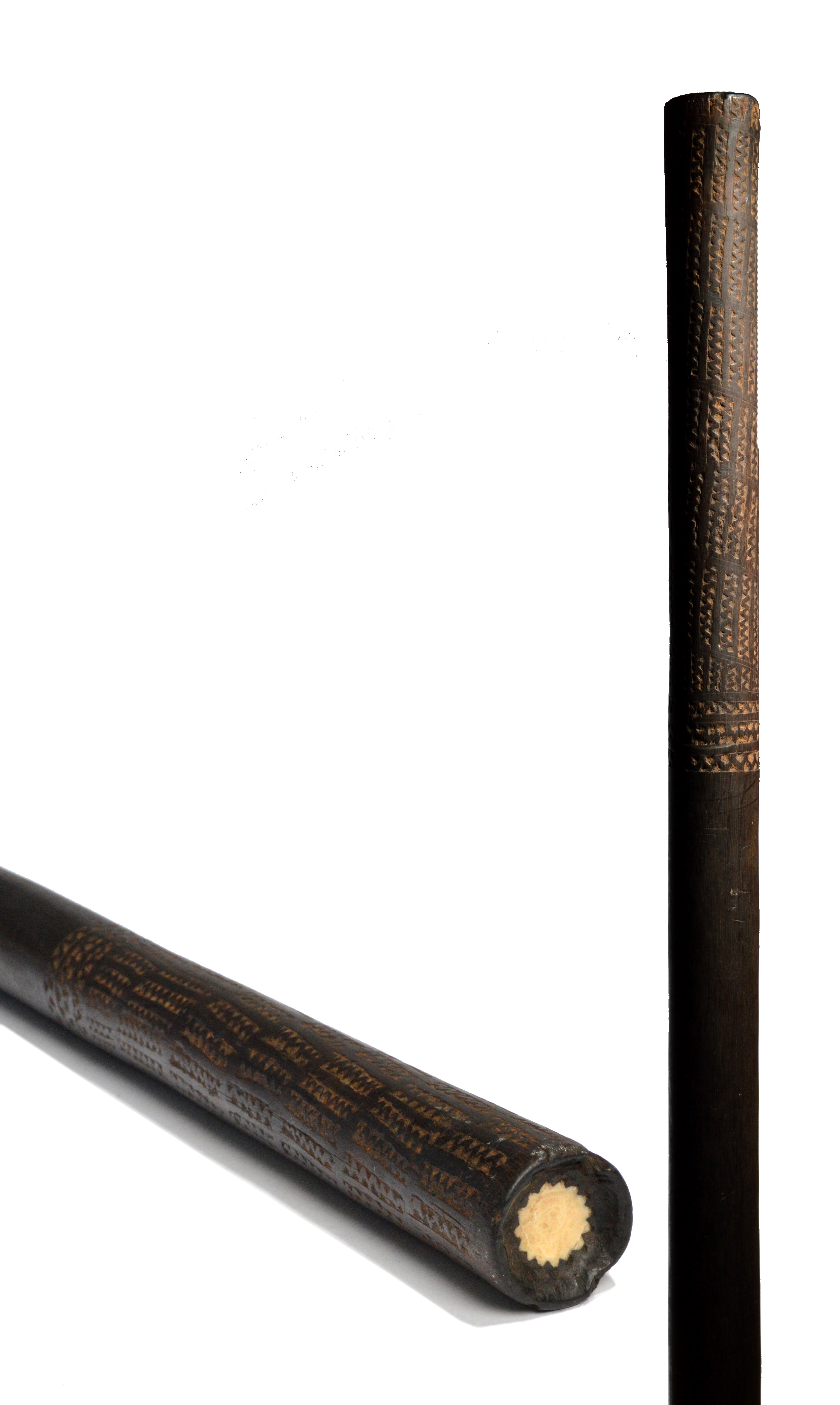 of slight tapering form with a rounded end, a carved zig-zag grip and the concave butt with an inlaid marine ivory star,