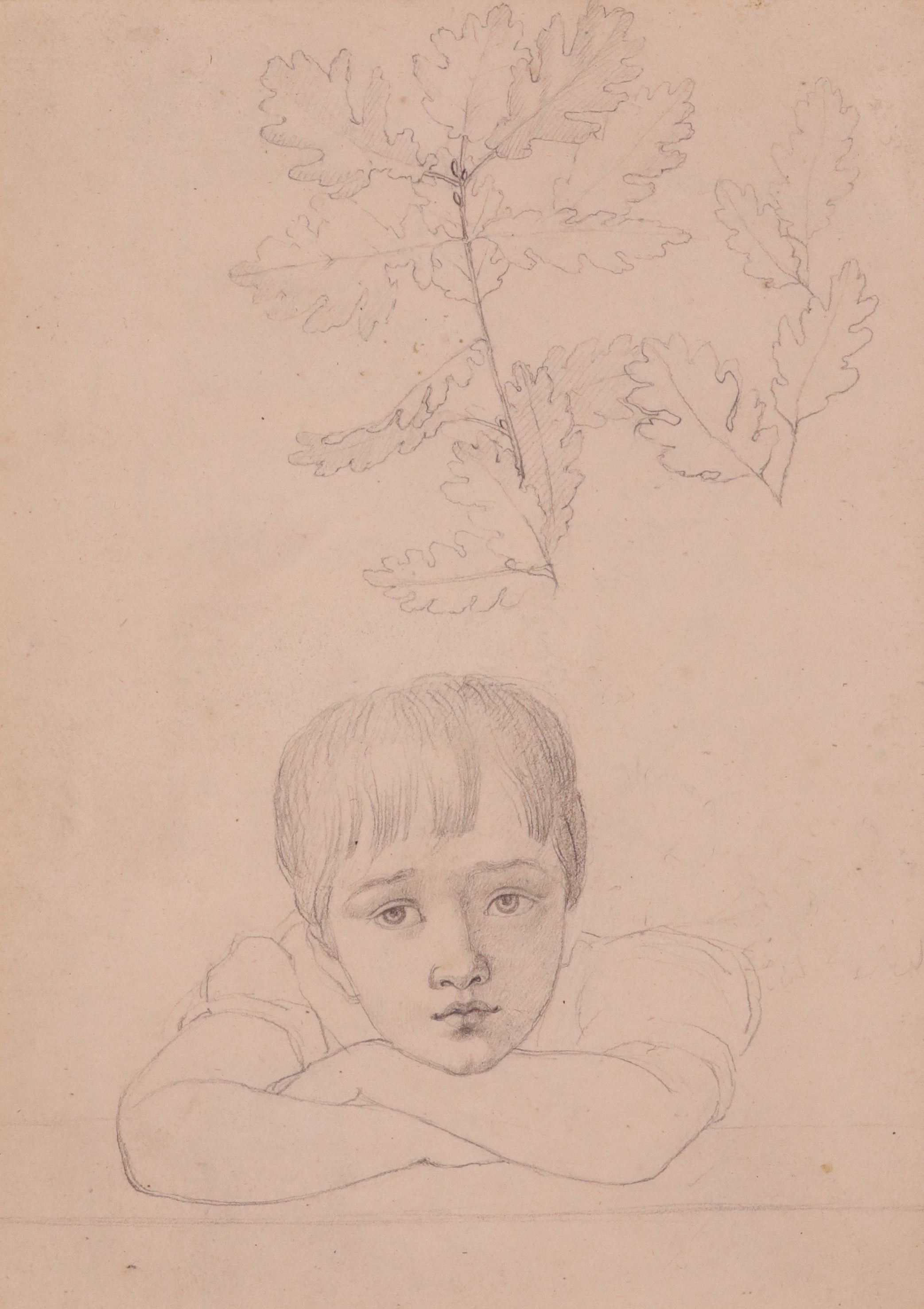 Peter Rittig (German 1789-1840) Portrait of a pensive boy with a study of a branch of an oak tree...