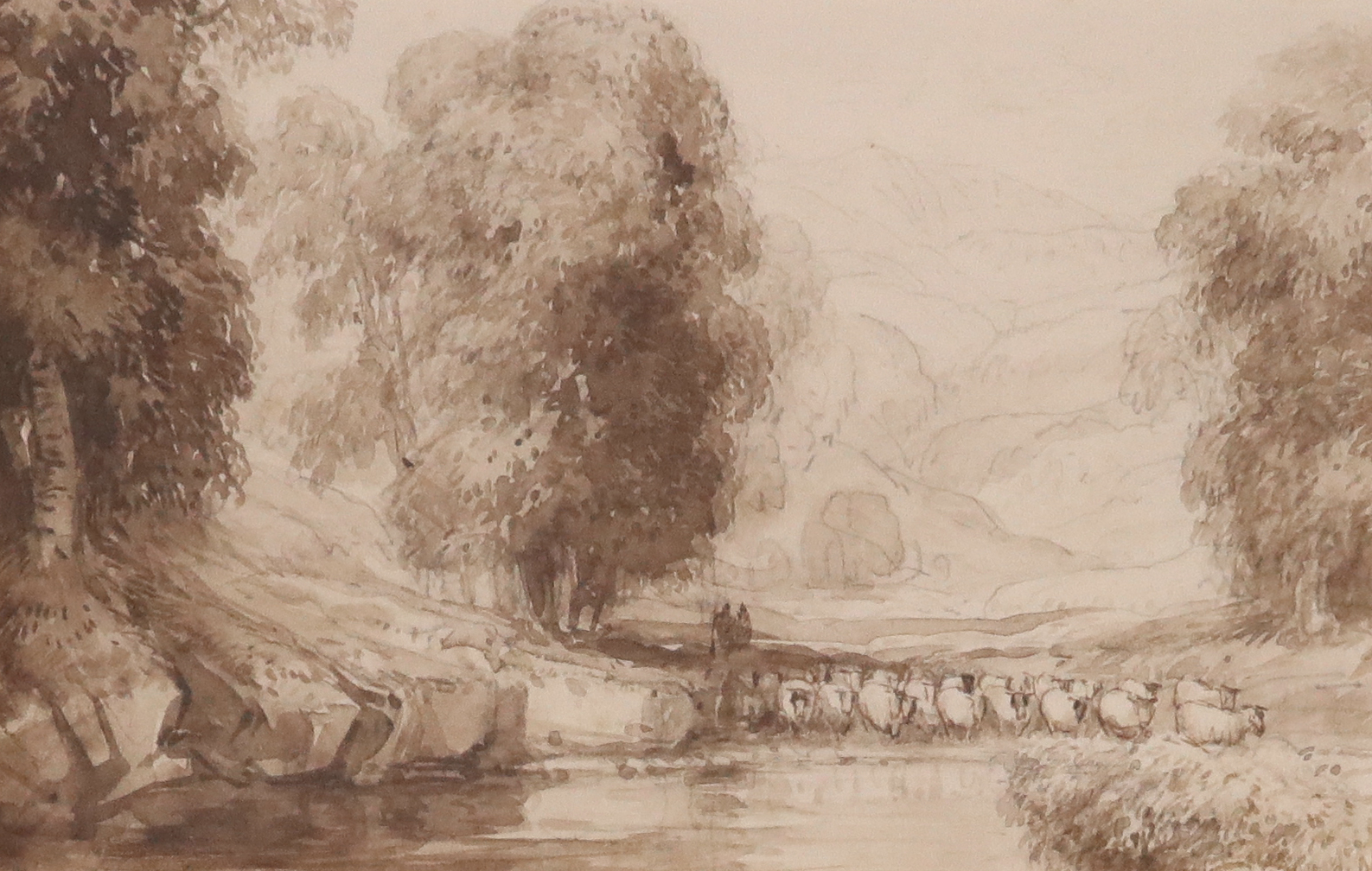 David Cox Snr. O.W.S. (1783-1859) A shepherd and flock in a river landscape Pencil and sepia...