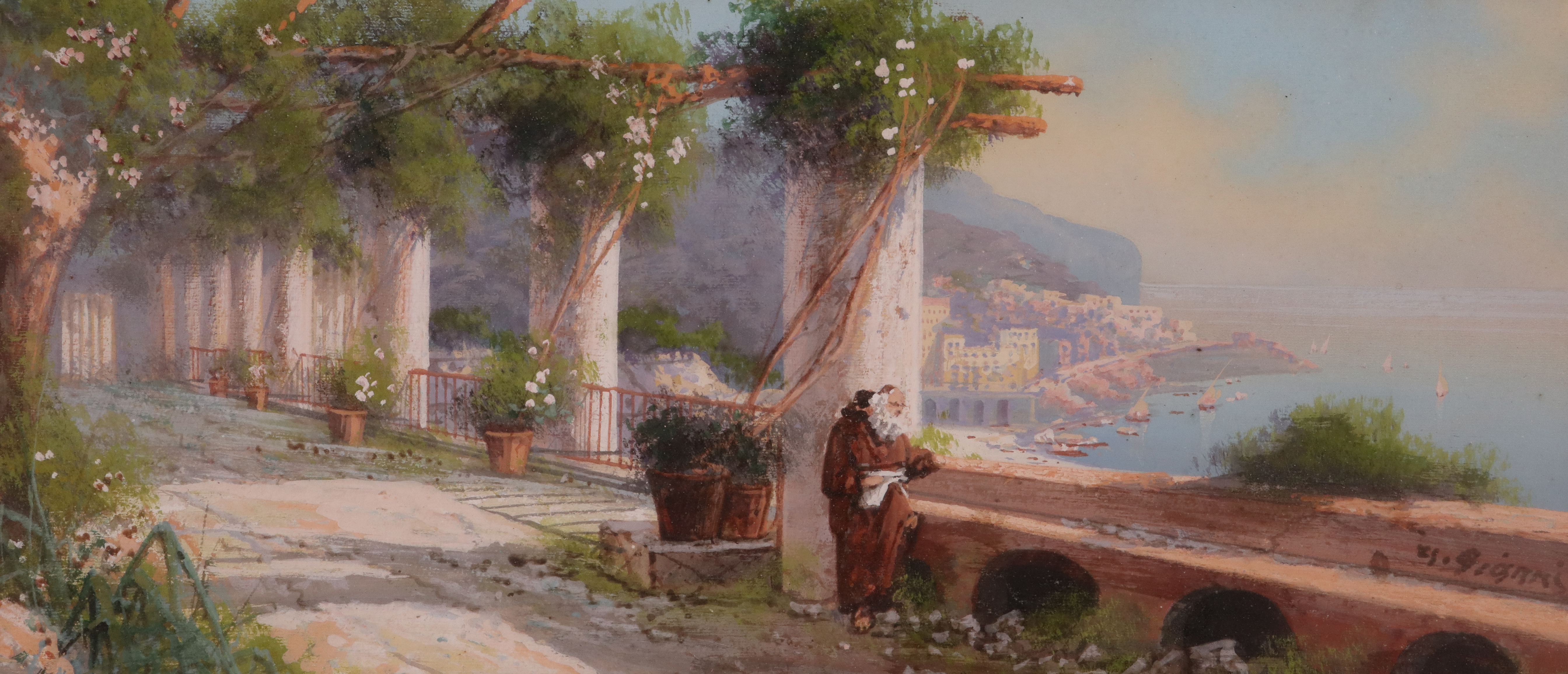 Gianni (Italian 19th Century) View on the Italian Amalfi coast; A monk on a terrace overlooking...