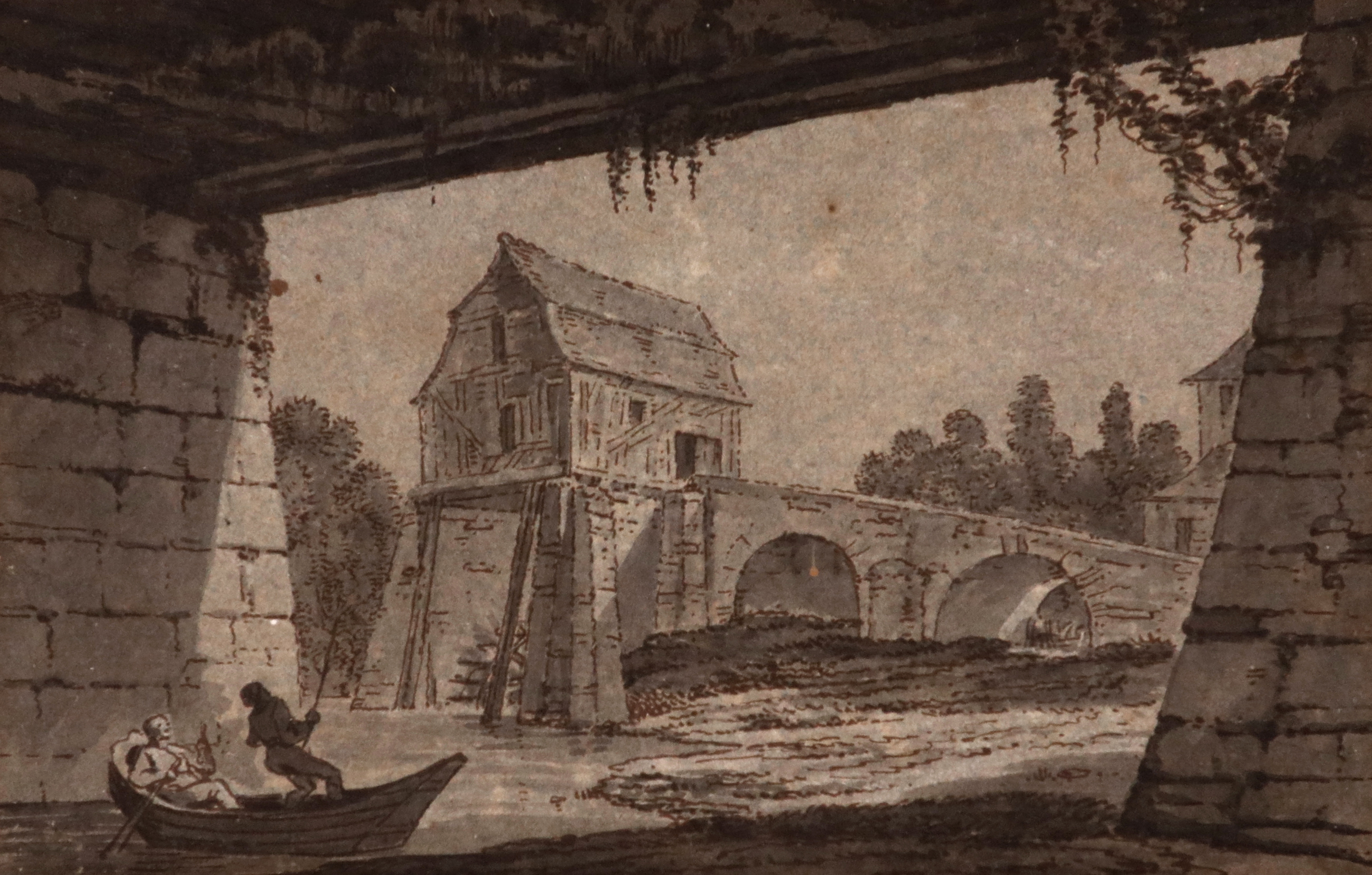 Attributed to Antoine Laurent Castellan (French 1772-1838) View of a river mill and bridge Pen