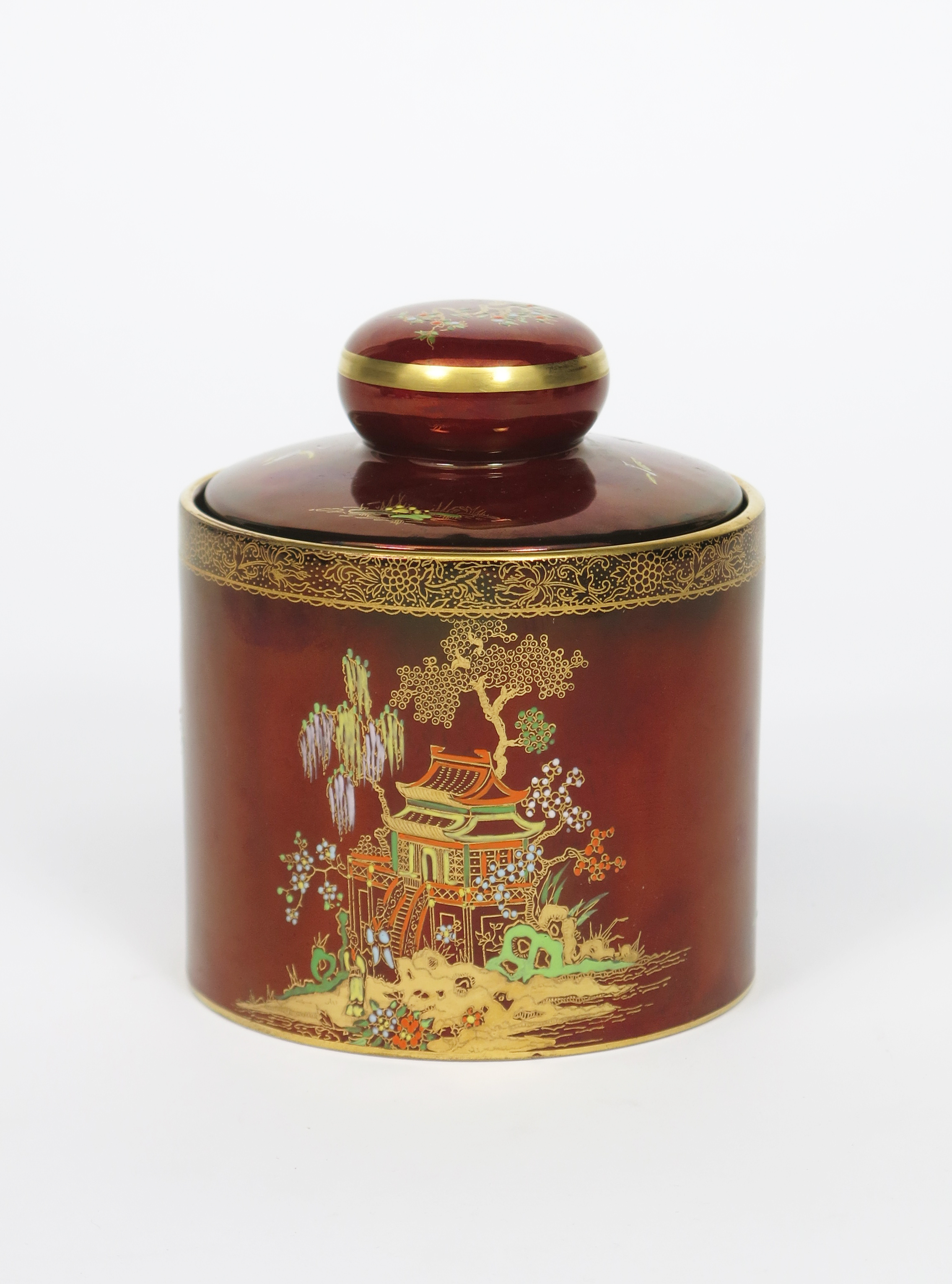 'Rouge Royale' a Carlton Ware tobacco jar and cover made for Dunhill, cylindrical form, printed and painted in colours and gilt on a red lustre ground, with a pagoda landscape, a Carlton Ware Rouge Royale Moderne jug, a Carlton Ware Rouge Royale vase with applied handles, a Rouge Royale pot and cover and a large collection of Rouge Royale ceramics printed factory marks, 15cm. high (a lot)