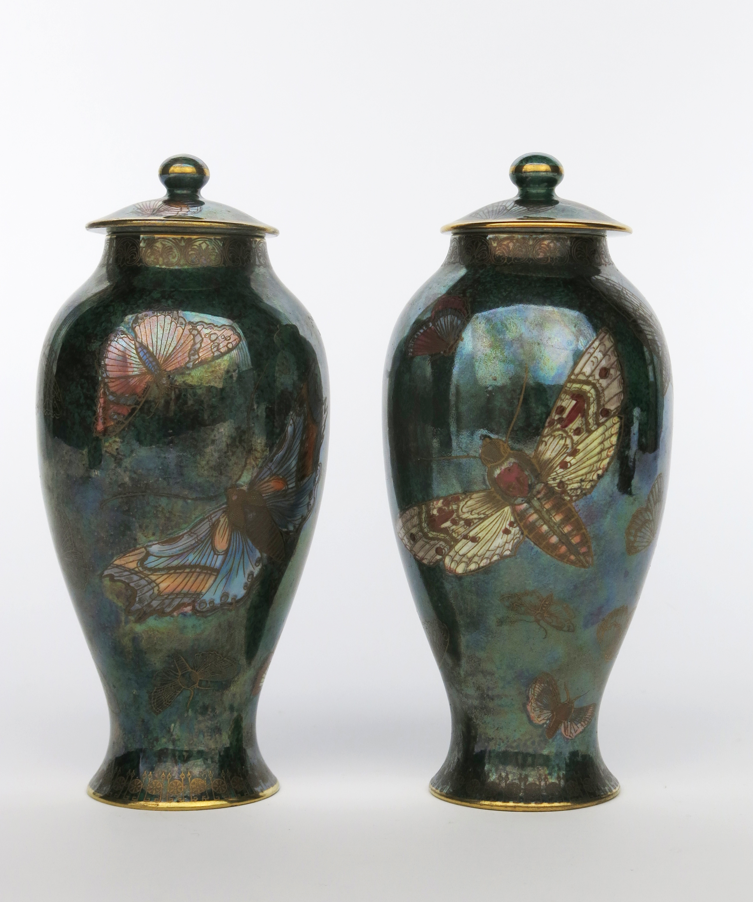 A pair of Carlton Ware Armand Lustre vases and covers, baluster form, printed and enamelled in colours and gilt with butterflies, on a mottled green lustre ground, printed and painted marks, 23cm. high, (4)