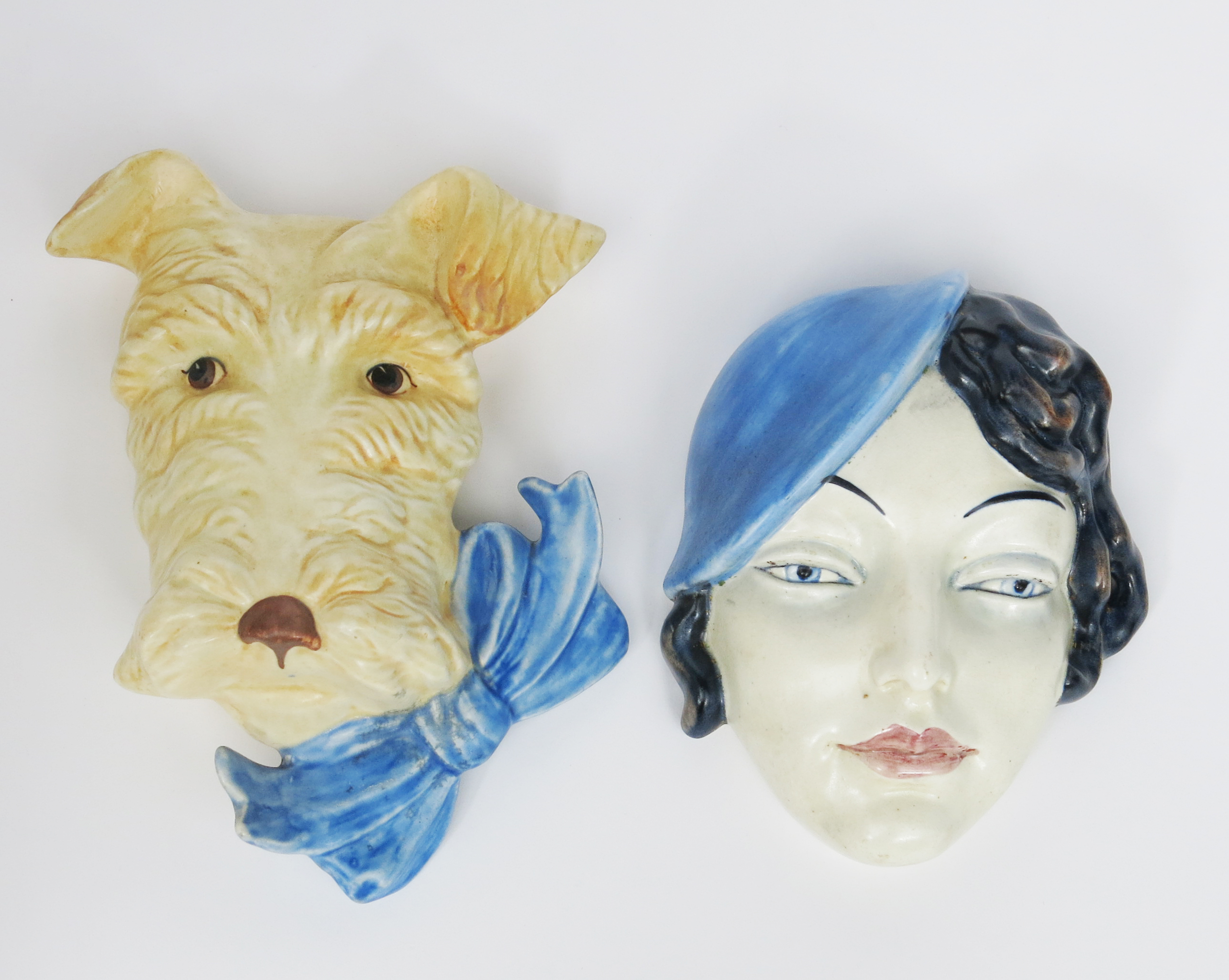'Girl in a Blue Beret' a Beswick Pottery wall mask, model no.197, painted in colours, and a Beswick Terrier wall mask, model no. 301, impressed marks, 16.5cm. high (Girl in beret), (2)