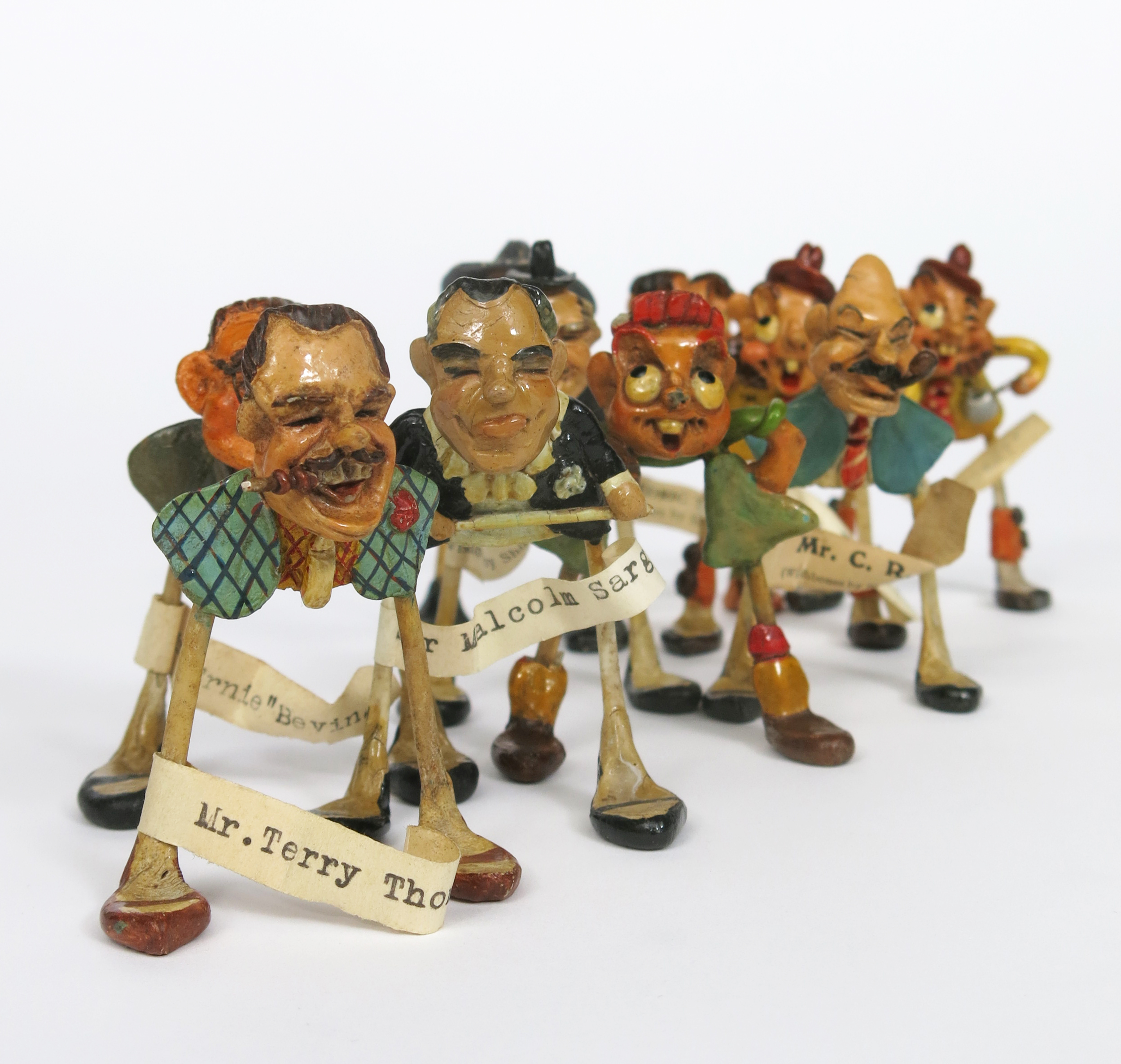 An entertaining collection of Wishbone figures by Robert Whiting, each figure made of a wishbone and clay, comprising Clement Attle, Ernie Bevan, Sir Anthony Eden, Sir Malcolm Sargent, Mr Terry Thomas, Charles Henry Bennett (Punch artist), Cedric The Caveman, a footballer and two Sam the Yokel figures, most with original paper labels, 7cm. high (10)