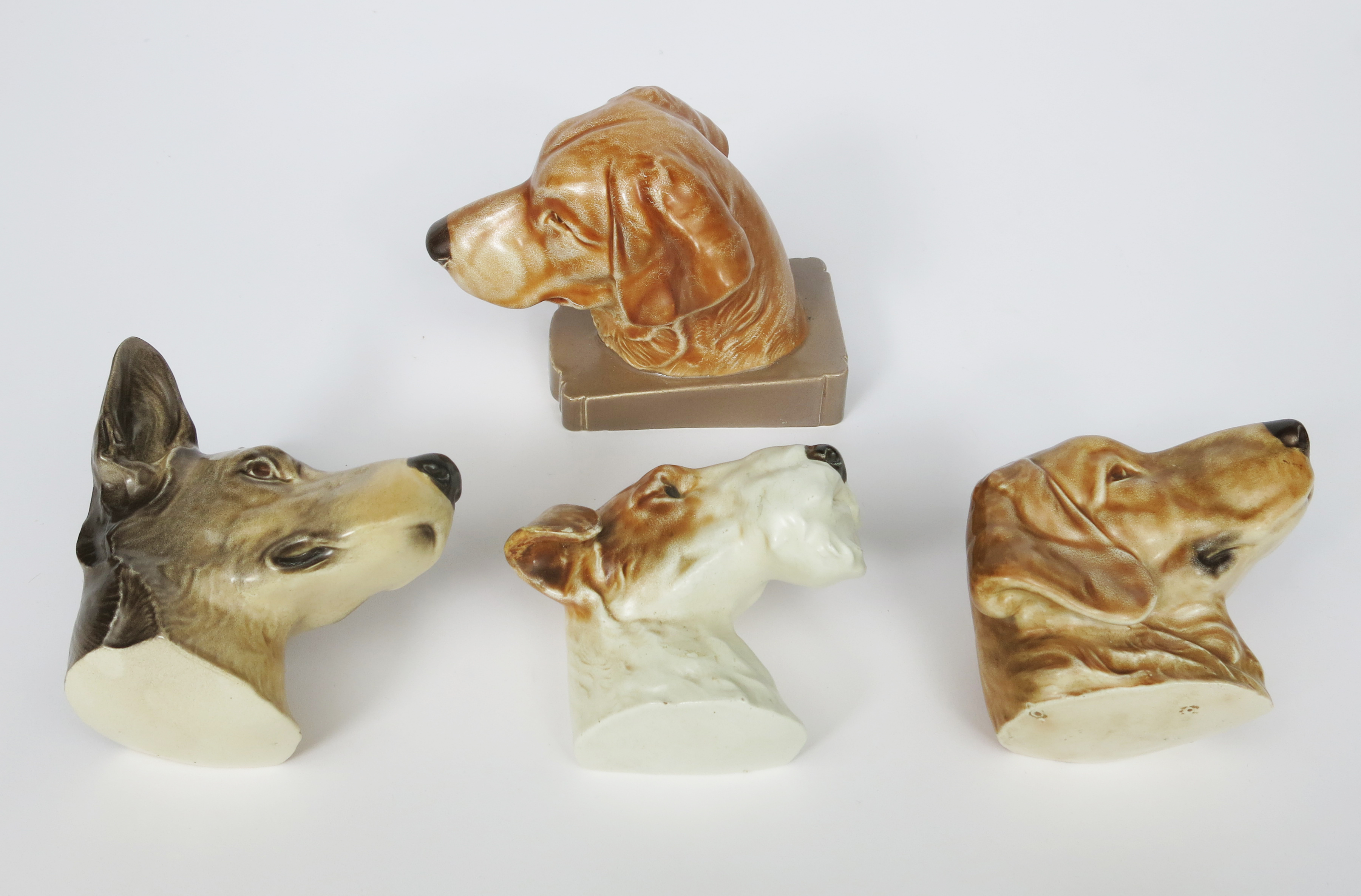 A Carter Stabler & Adams Poole Pottery model of a squirrel probably designed by Harold Stabler, modelled standing on hind legs and eating a nut, covered in an orange (uranium) glaze, a Poole Pottery Picotee glazed Retriever bust probably designed by Harry Brown, a Poole Pottery German Shepherd (alsation), Terrier and Retriever wall masks impressed marks, 16.5cm. high (squirrel) (5)