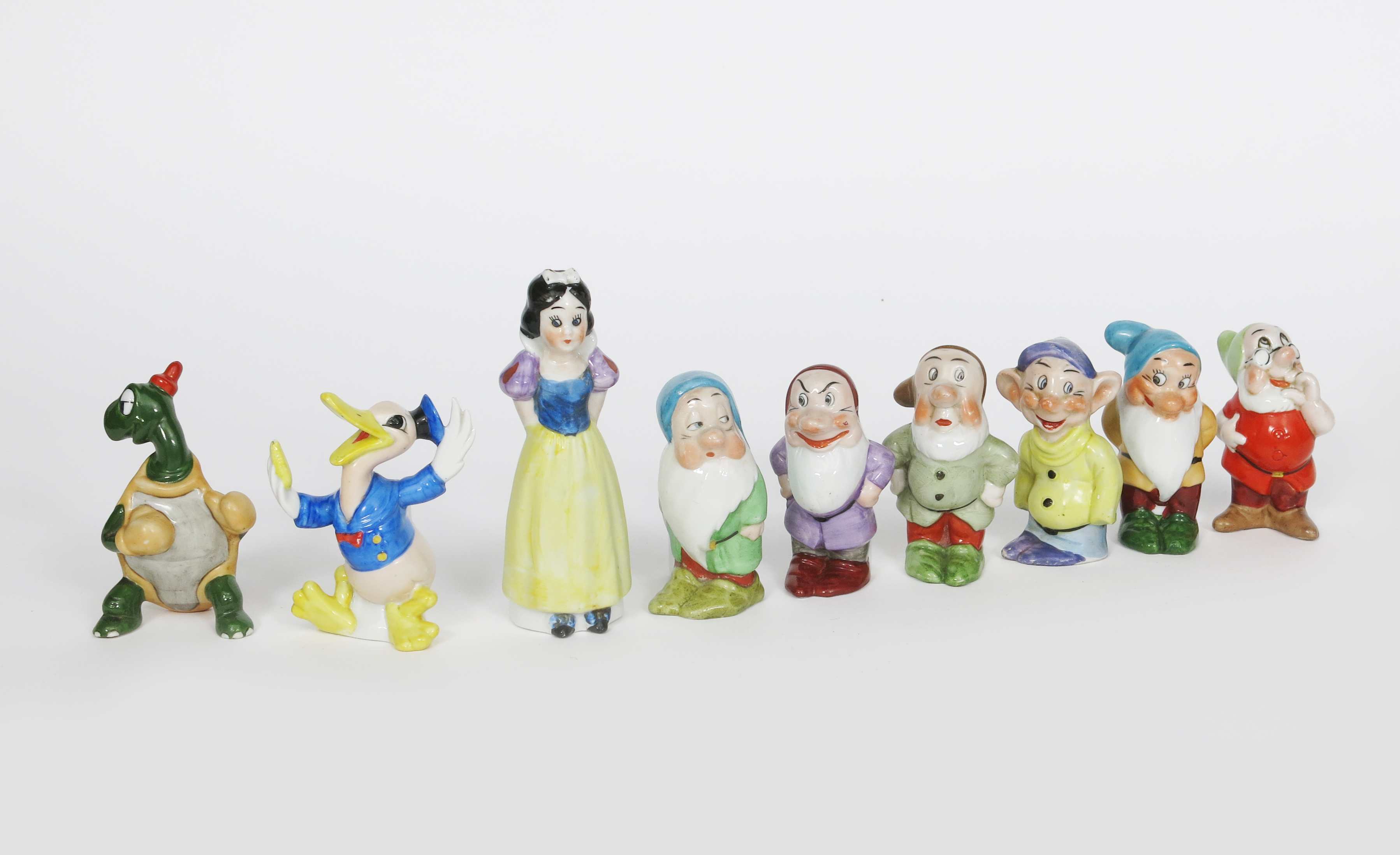 'Snow White and the Seven Dwarfs' seven Walt Disney pottery tooth brush holder figures, comprising Snow White and six of the dwarfs, painted in colours, and two additional Walt Disney tooth brush holders modelled as Donald Duck and Toby Tortoise wearing boxing gloves, printed Walt Disney Foreign to bases, 14.5cm. high (Snow White), (8)