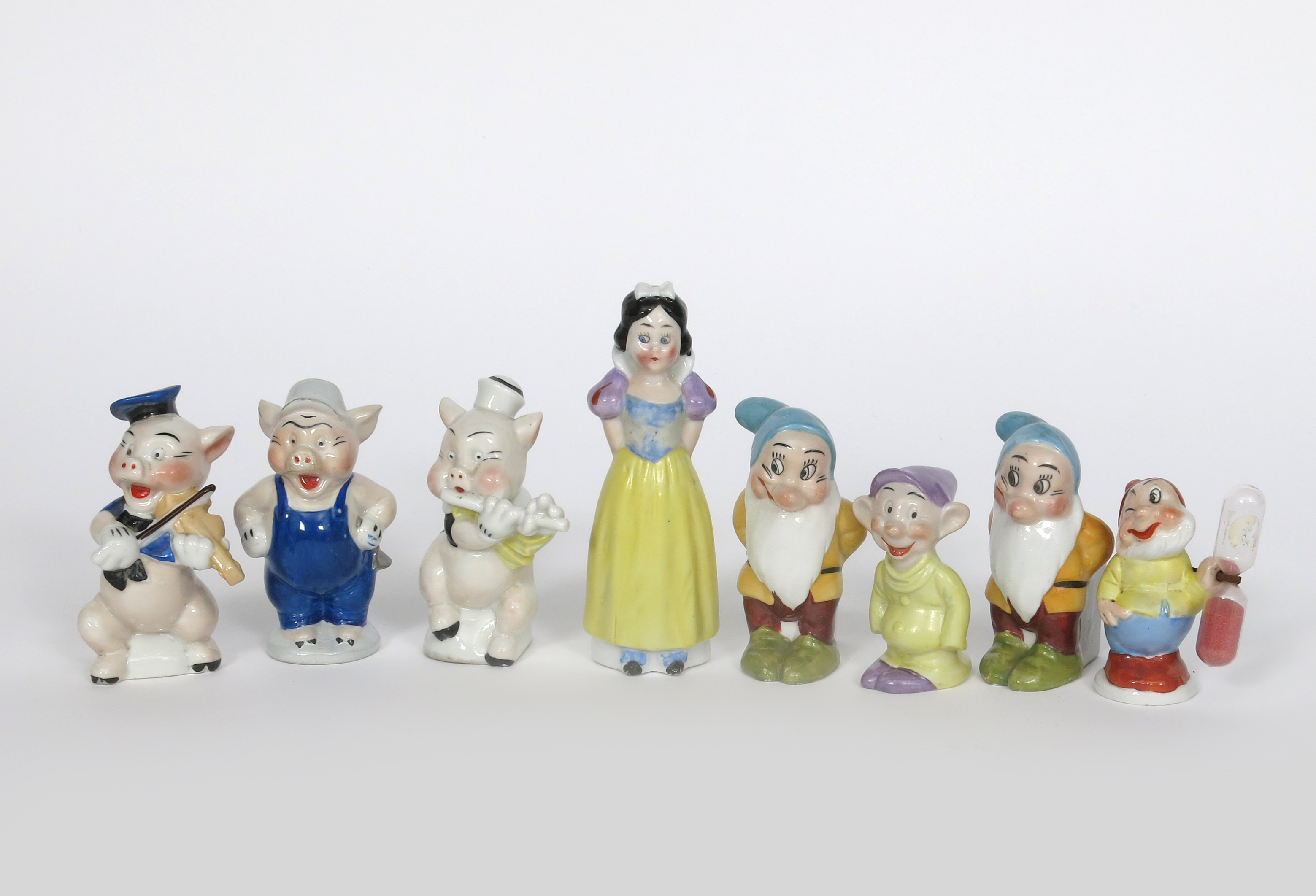'Snow White and the Seven Dwarfs' four Walt Disney Foreign tooth brush holder figures, comprising Snow White, Dopey and two Bashful figures, a Walt Disney Happy dwarf sand-timer, a Walt Disney's Three Little Pigs tooth brush holders, printed marks, 15cm. high (Snow White), (8)