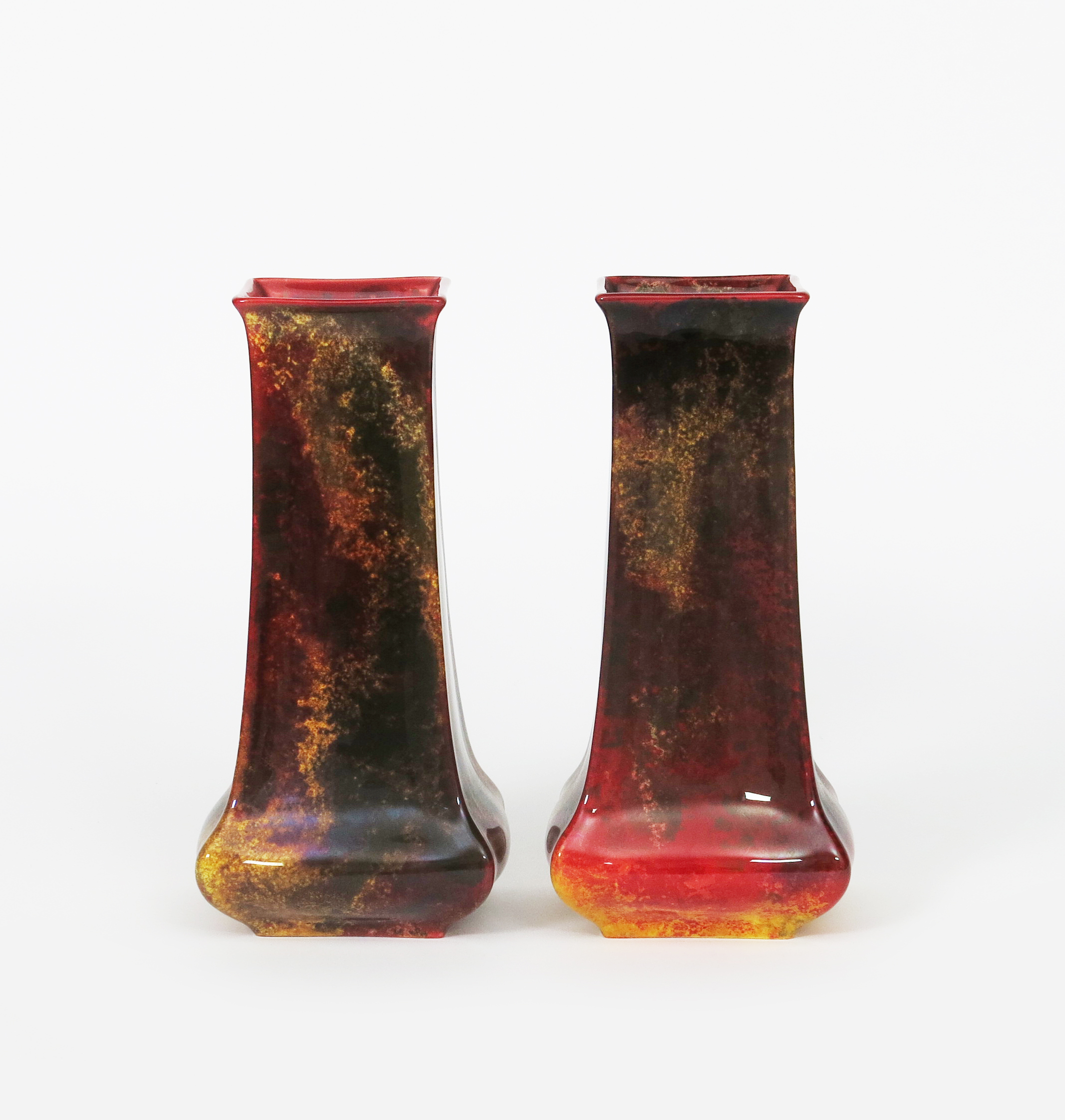 A pair of Royal Doulton flambe vases by Harry Nixon, tapering square section with everted rim and swollen base, covered in a mottled red flambe glaze over orange and ochre printed factory marks, painted HN monogram, 26.5cm. high, (2)