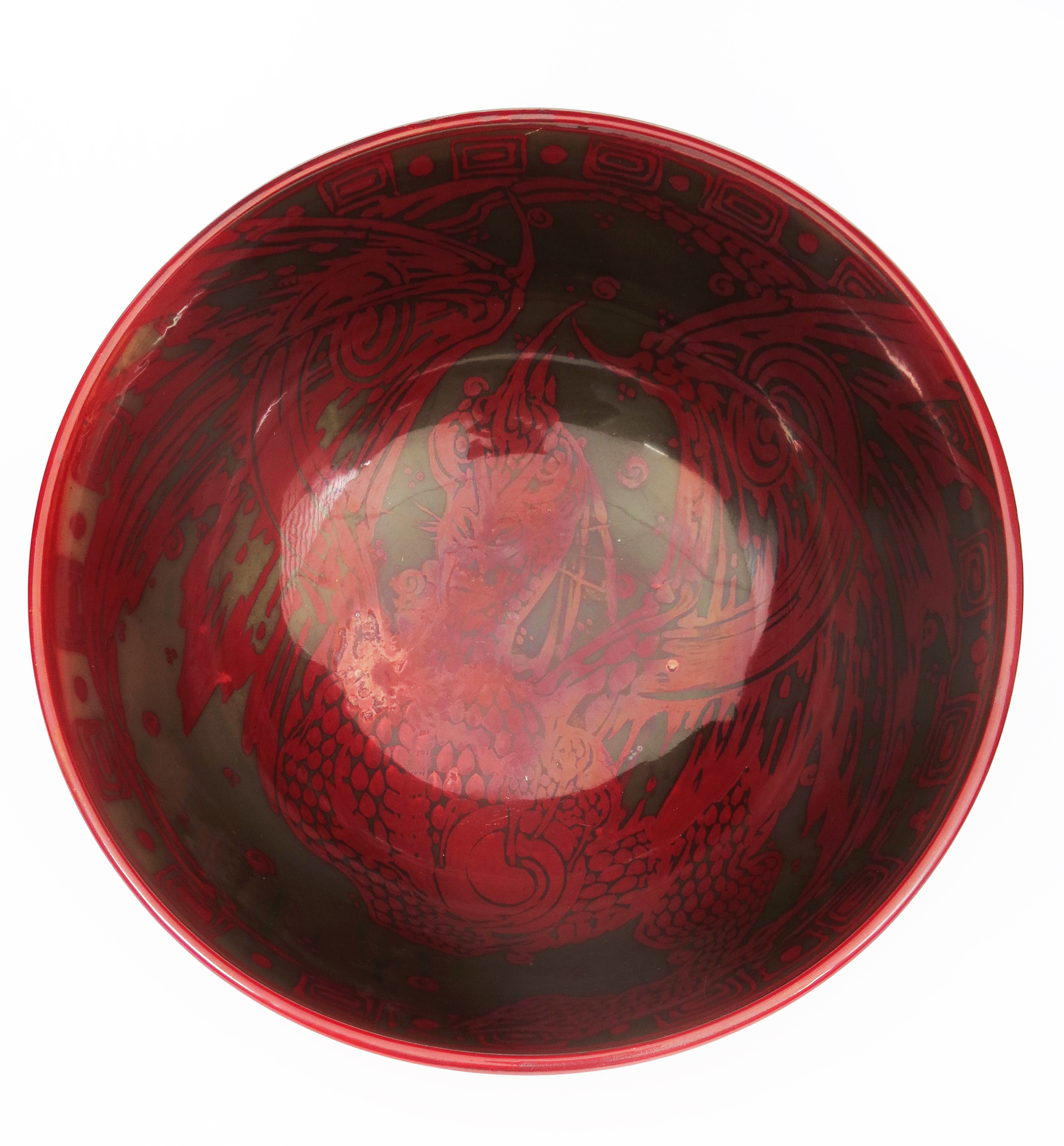 A large Bernard Moore flambe bowl by R R Tomlinson, internally painted with a ferocious dragon looking directly out, in red flambe on a smoked ground, the exterior glazed flambe red, painted Bernard Moore and artist monogram, impressed marks, 36cm. diam.