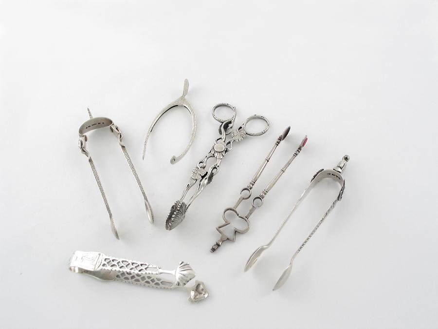 Six various Victorian and later pairs of sugar tongs/nips including: a naturalistic pair of nips, a sprung "wishbone" with a hammered finish, a pair of andiron tongs, a pair with Egyptian masks, a pair commemorating William Shakespeare & Stratford on Avon, and a small cast arm pair. (6)