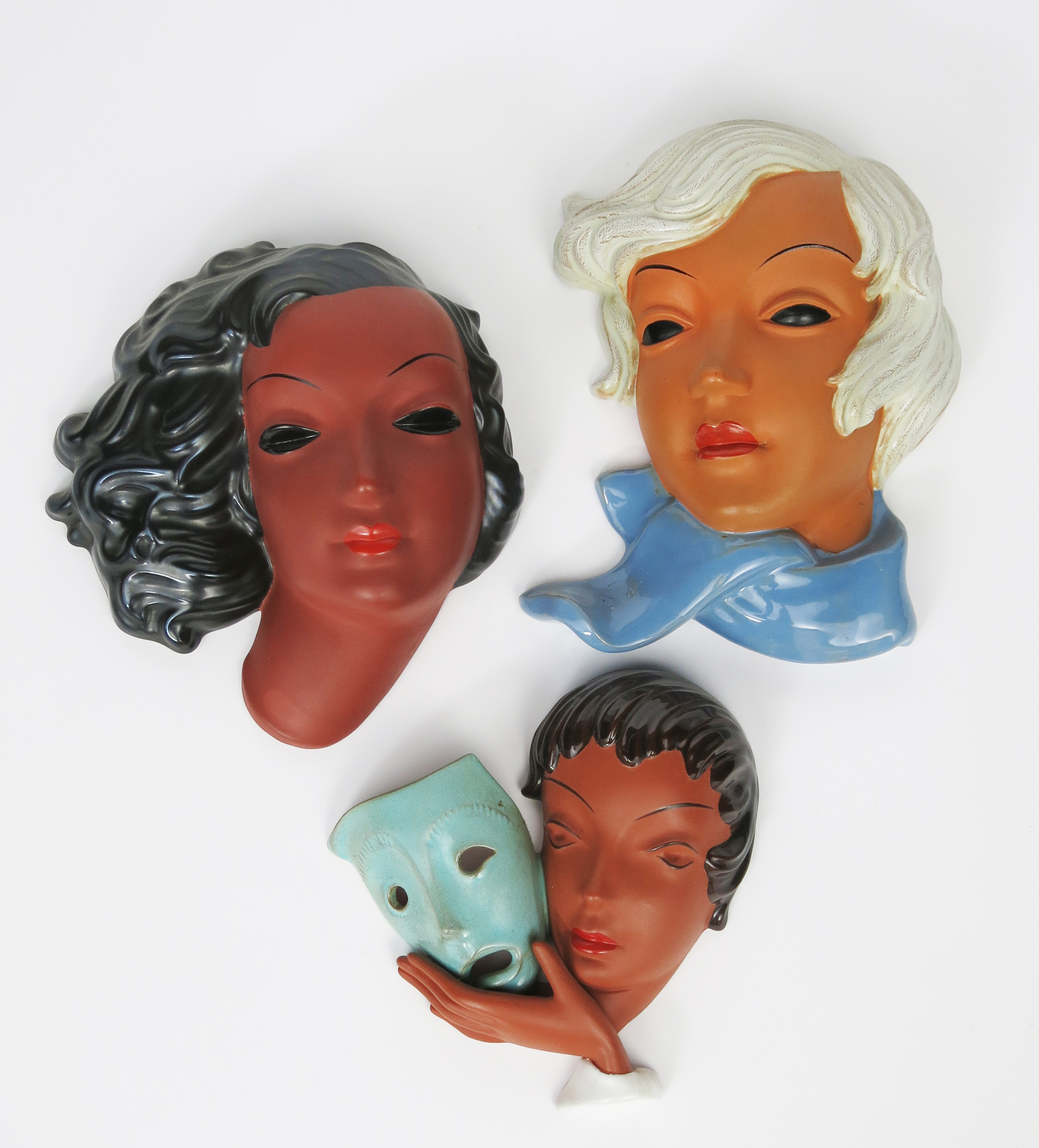 A small Goldscheider Pottery wall mask of a woman holding a mask, model no.8935, glazed in colours a Goldscheider wall mask of a woman with white hair blowing in the wing and another of a woman with black hair, printed West German marks, impressed numbers, original paper label to main, 21.8cm. high (smallest), (3)