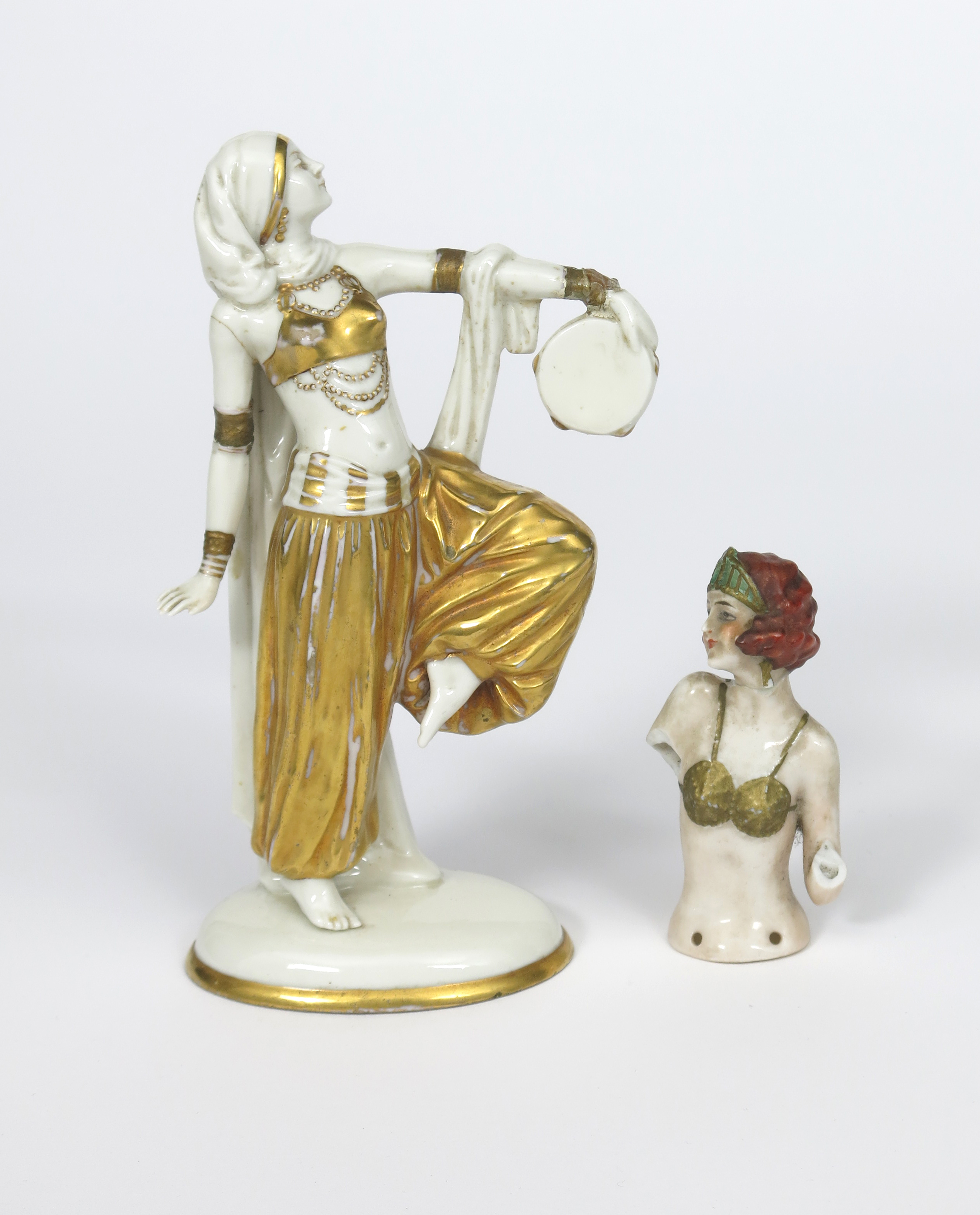 A Sitzendorf model of an exotic dancer, modelled holding a tambourine, the costume highlighted in gilt, and an Art Deco porcelain half-body figure printed factory marks, damages, 19cm. high