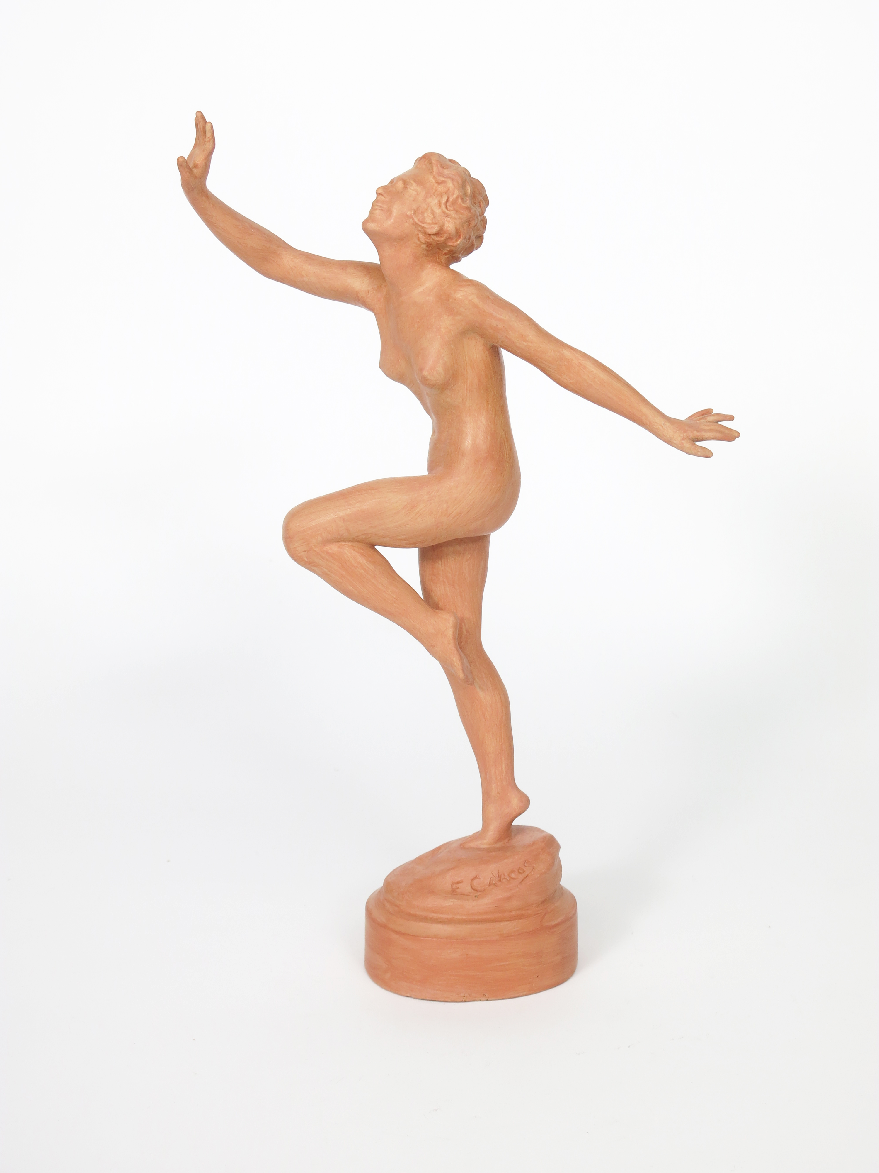 a pottery sculpture of a naked woman, modelled standing on one leg her arms outstretched for balance, on oval base signed in the base E Cavacos 42.5cm. high