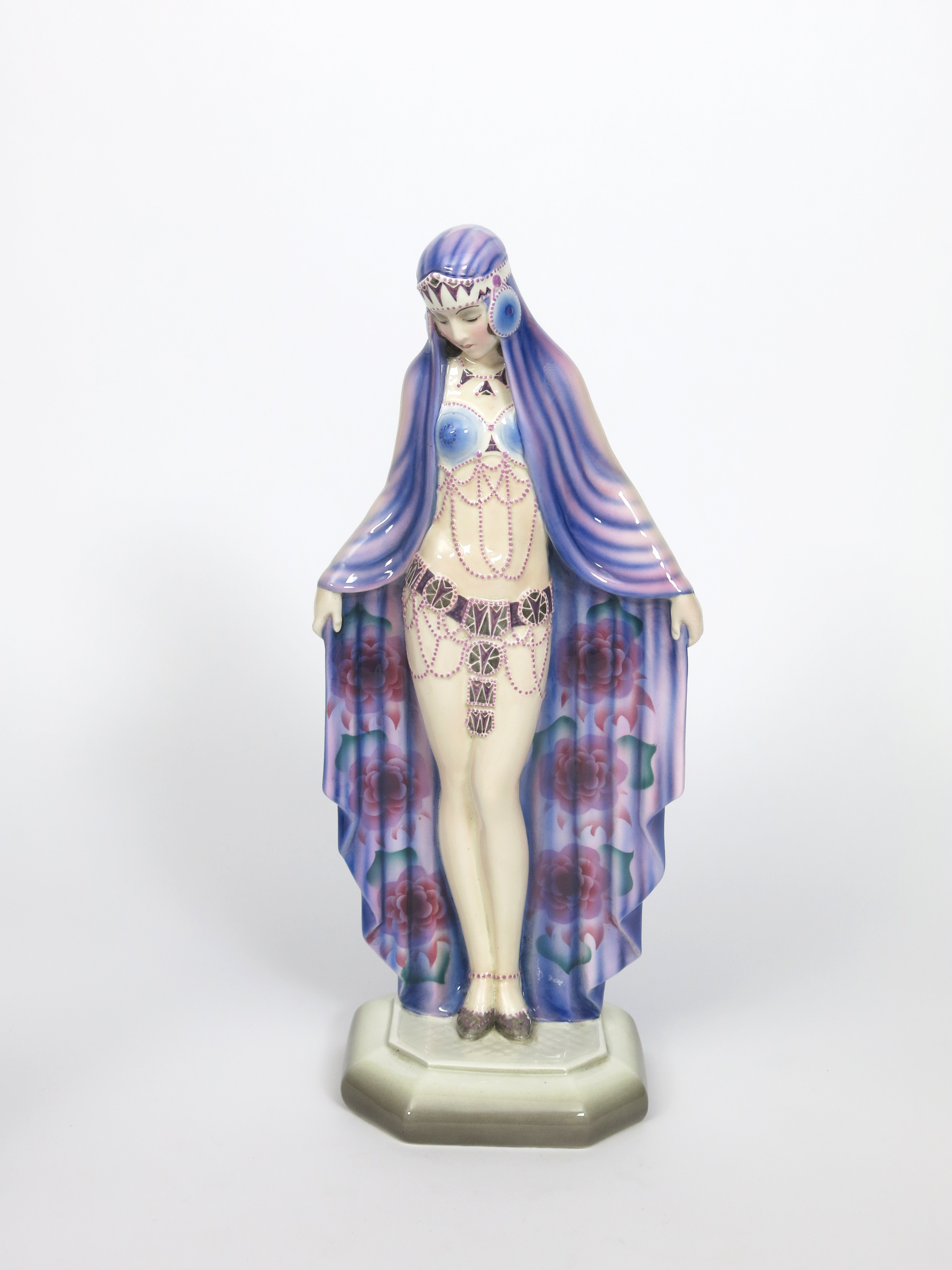 A large Goldscheider Pottery bust of woman designed by Josef Lorenzl, model no.5927, modelled standing in exotic costume, headdress and purple cape, on domed octagonal base, Impressed factory marks, printed marks and impressed facsimile signature, small glaze chip to cloak rim, 44.5cm. high