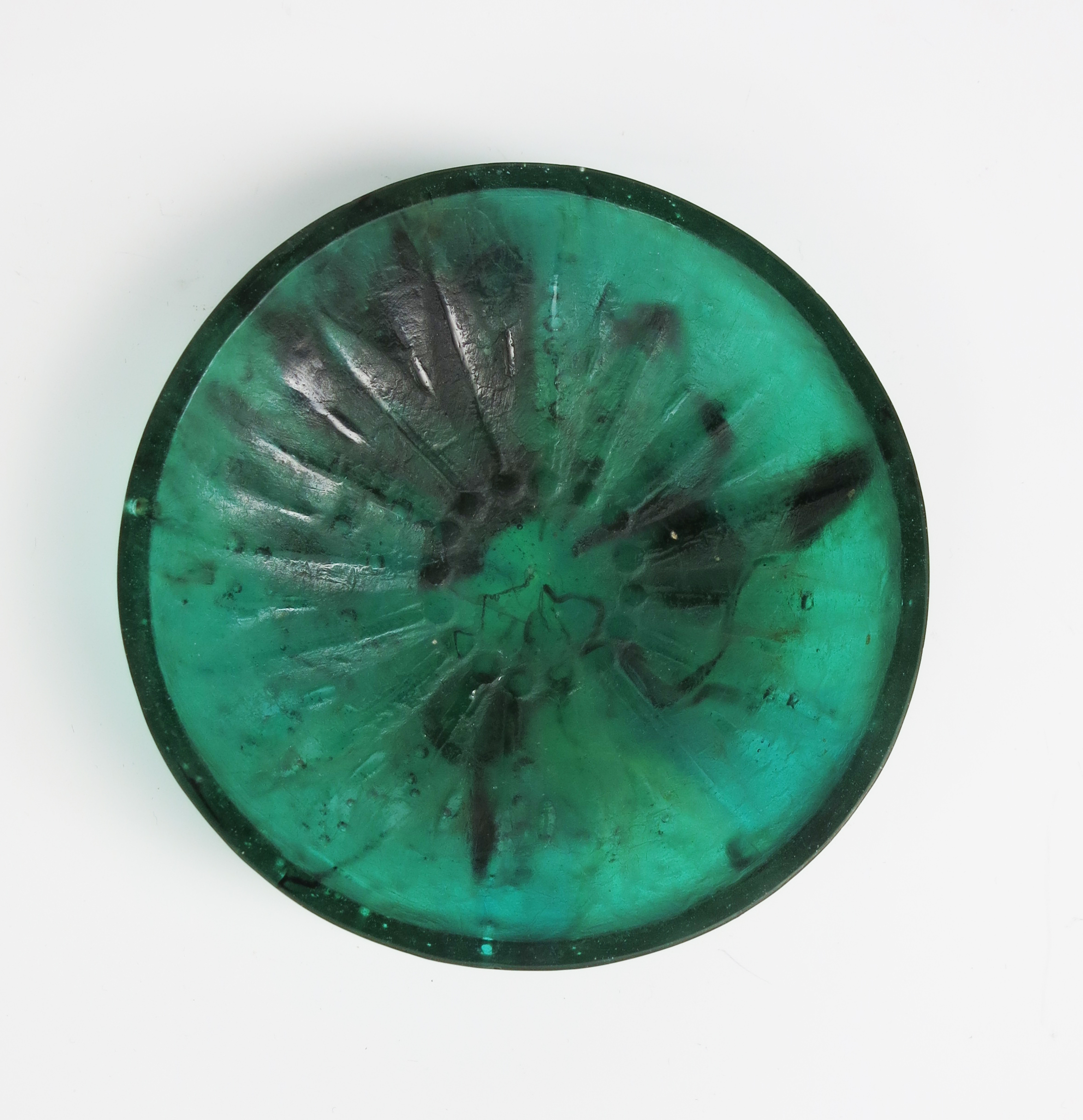 Cendrier Etoile a Decorchemont pate de crystal bowl designed by Francois Emile Decorchemont, green glass, on three applied ball feet, cast in low relief with radiating lines, impressed cast mark, etched B81, 14cm. diam.