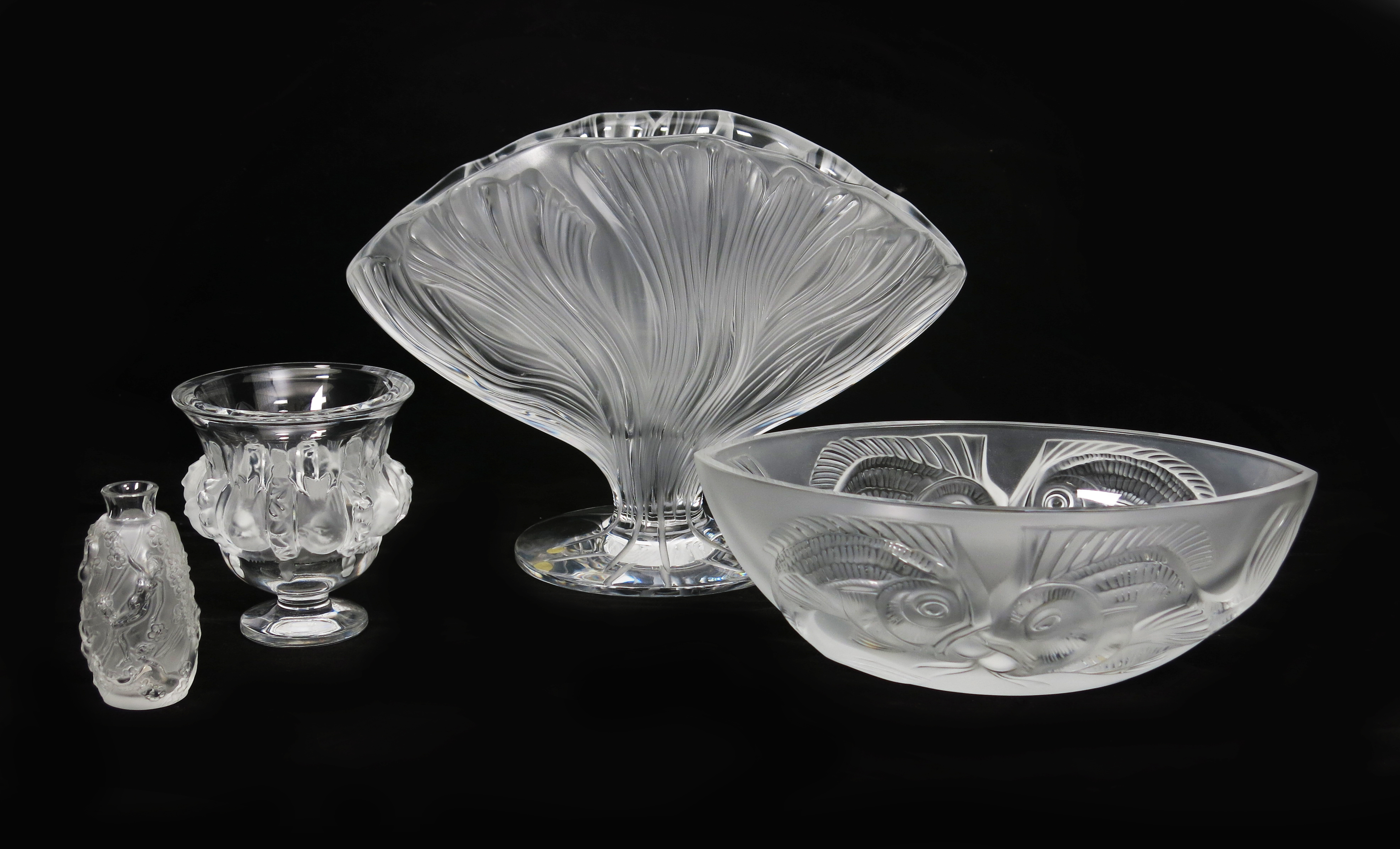 A modern Lalique clear and frosted glass bowl, elliptical section, moulded in relief with stylised fish, a modern Lalique fan shaped vase, a modern Lalique 'Dampierre' urn shaped vase and a small Lalique scent bottle, etched Lalique France 29cm. wide, (4)