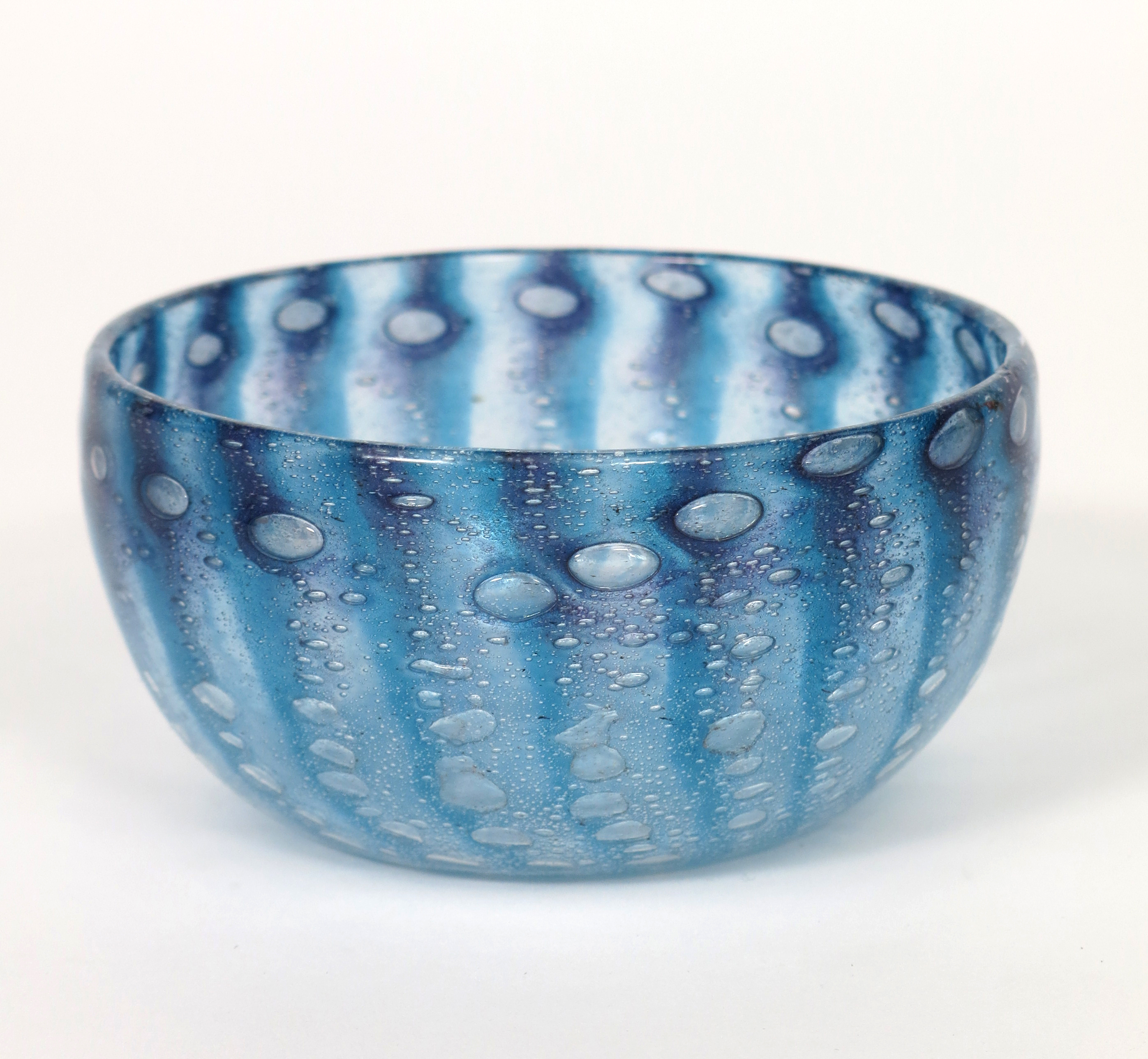 A Moncrieff's Monart Ware glass bowl, clear glass with blue graduating to purple stripes, with controlled air bubble columns and band to the top, cased in clear unsigned, 11cm. diam.