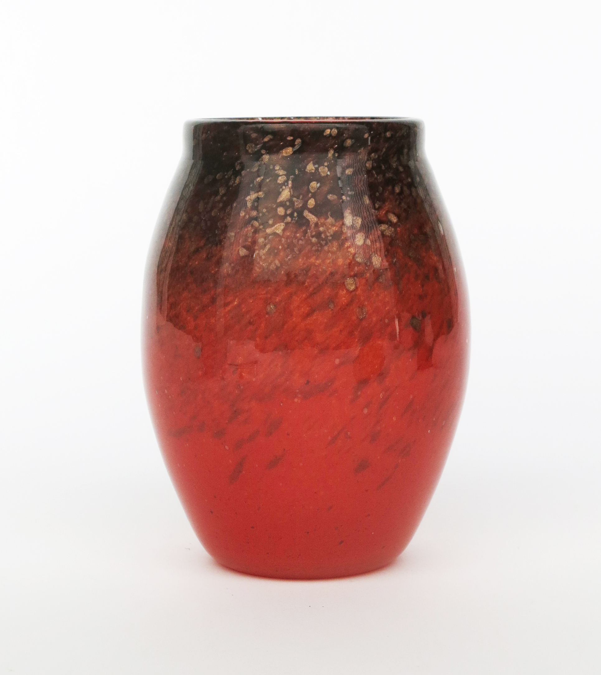 A Moncrieff's Monart Ware glass, shouldered form with collar rim, clear glass, mottled red graduating to aubergine to shoulder and neck, with splashed of aventurine, unsigned, 20cm. high