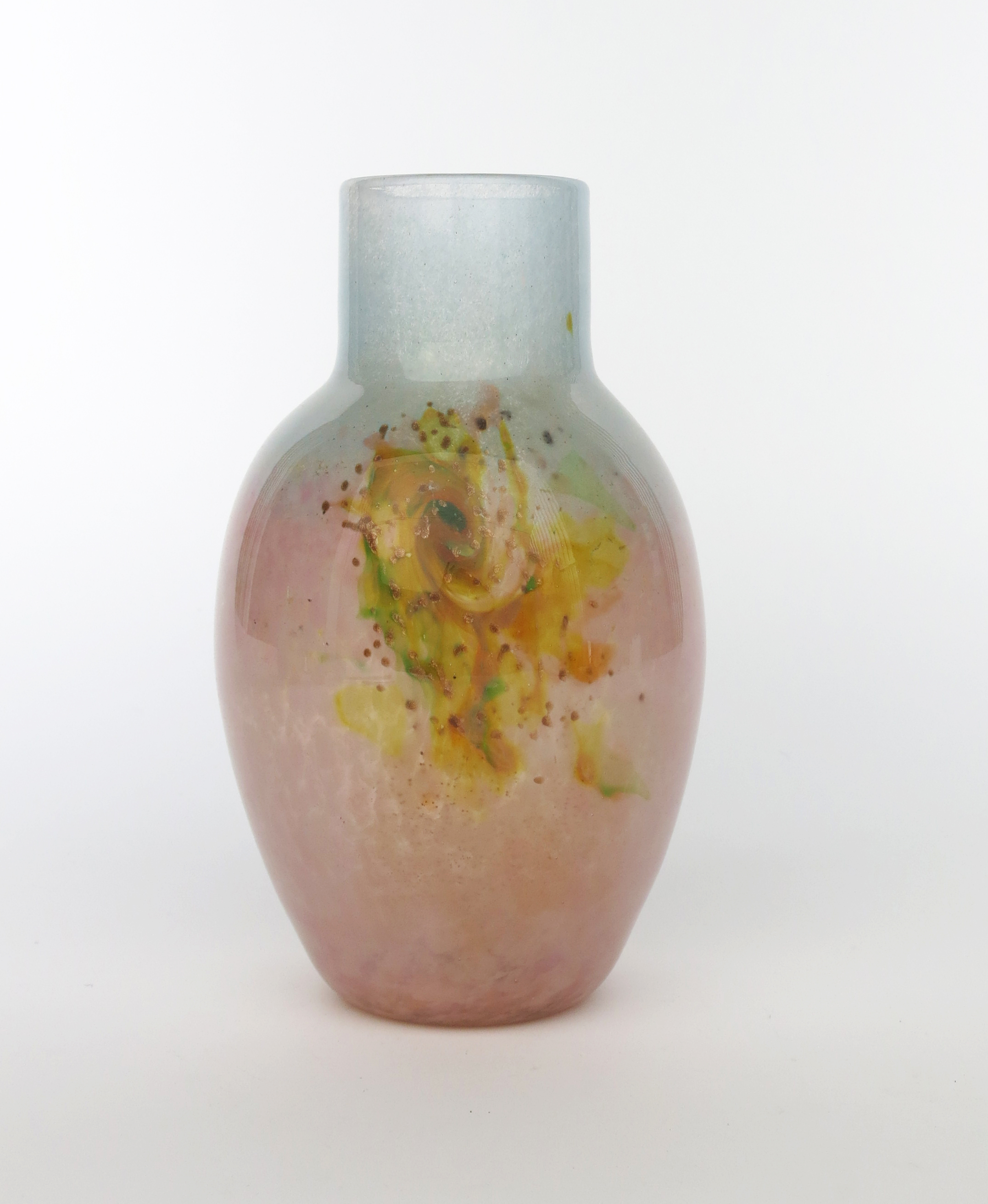 A Moncrieff's Monart Ware glass vase, shouldered ovoid form, clear glass with pale blue graduating to pink, the body with panels of green and yellow whorls, with aventurine inclusions, unsigned, 28.5cm. high