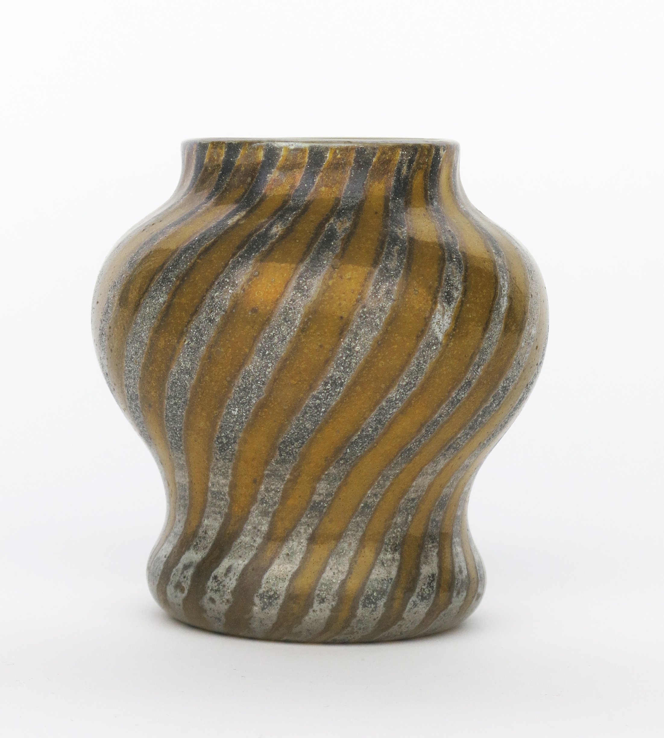 A Moncrieff's Monart Ware glass vase, opaque glass, surface decorated with yellow and lustred white stripes, applied collection label, 13cm. high