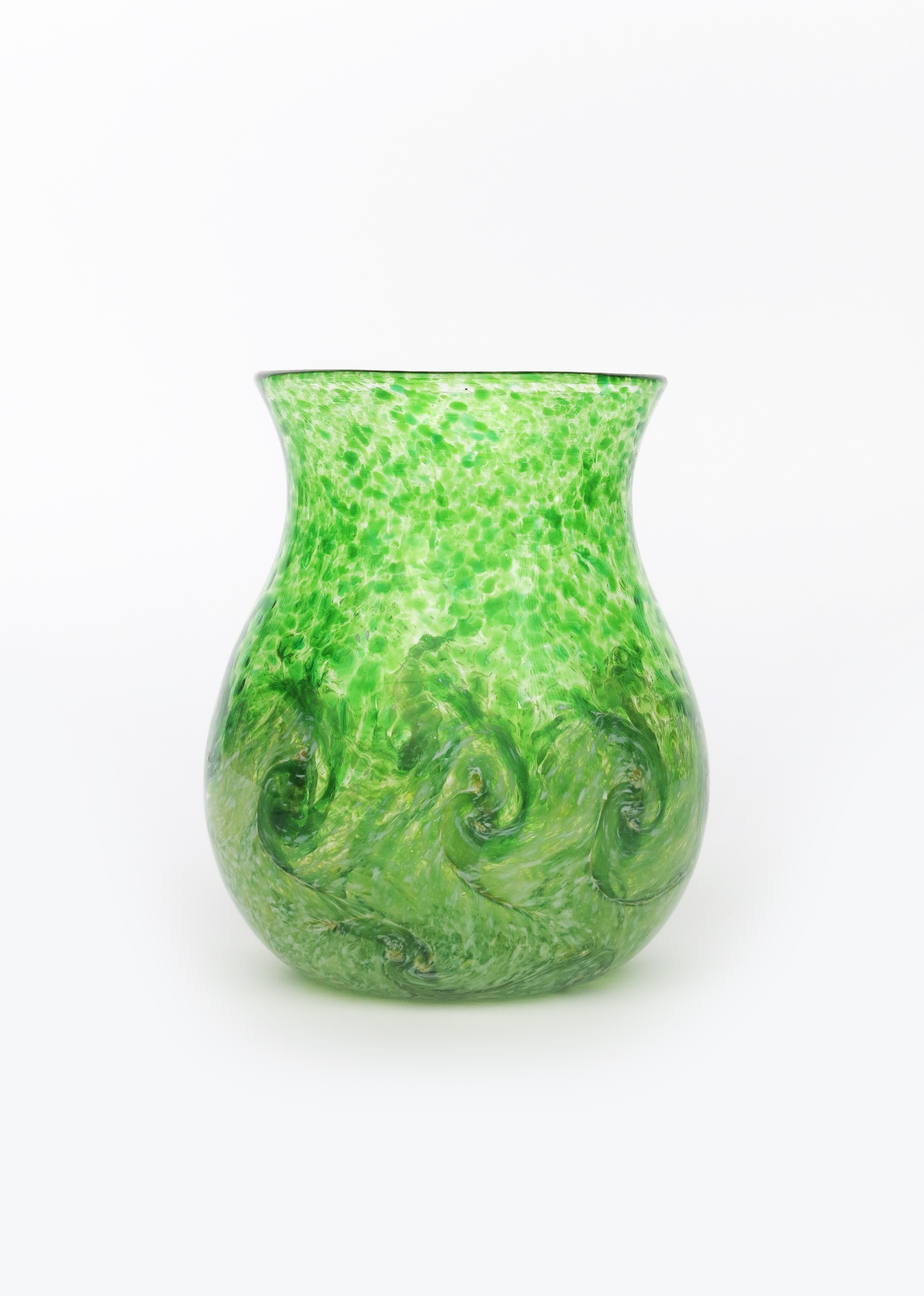 A Moncrieff's Monart Ware glass vase, shape VI, waisted form, clear glass with vivid green spot decoration, with white whorls towards the base of the body, paper collection label, 20cm. high