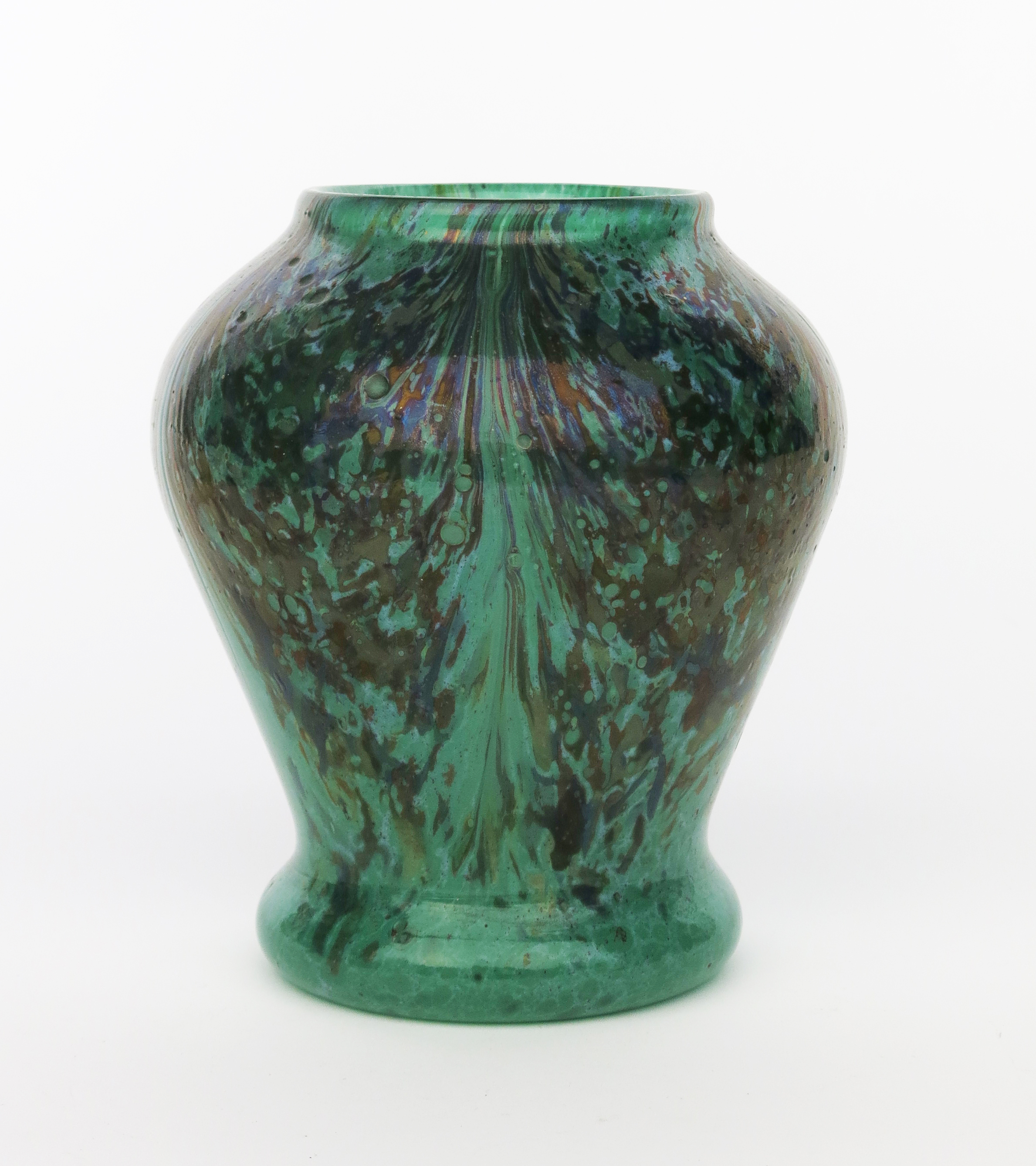 A Moncrieff's Monart Ware Stoneware vase, shape, clear liner, mottled green glass with blue pulls and surface iridescence, unsigned 17cm. high