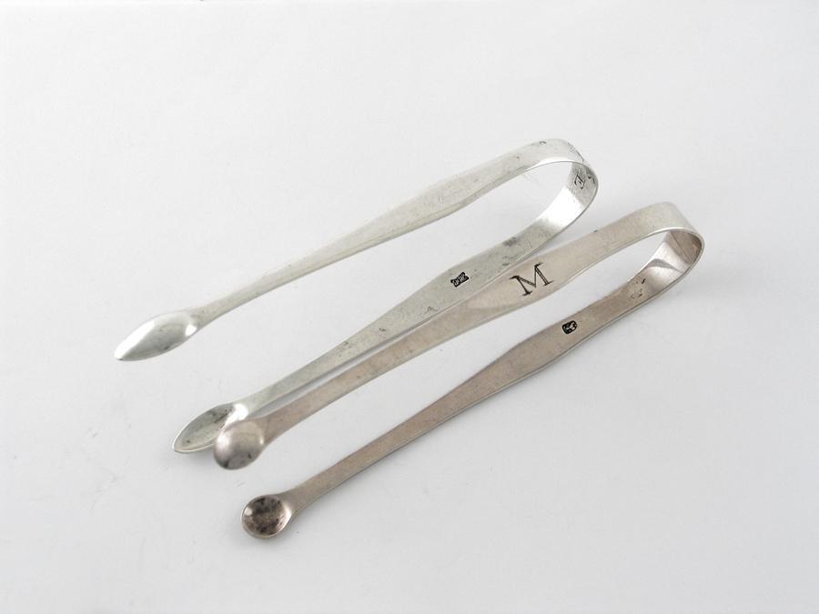 Two pairs of George III plain sugar tongs, by Hester Bateman: one initialled "H", the other with script initials, c.1770 and c.1785 (respectively). (2)