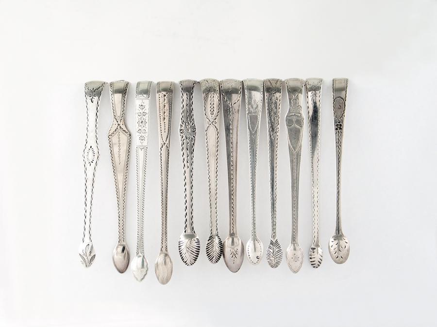 Twelve various pairs of George III bright-engraved sugar tongs, mixed makers and dates. (12)