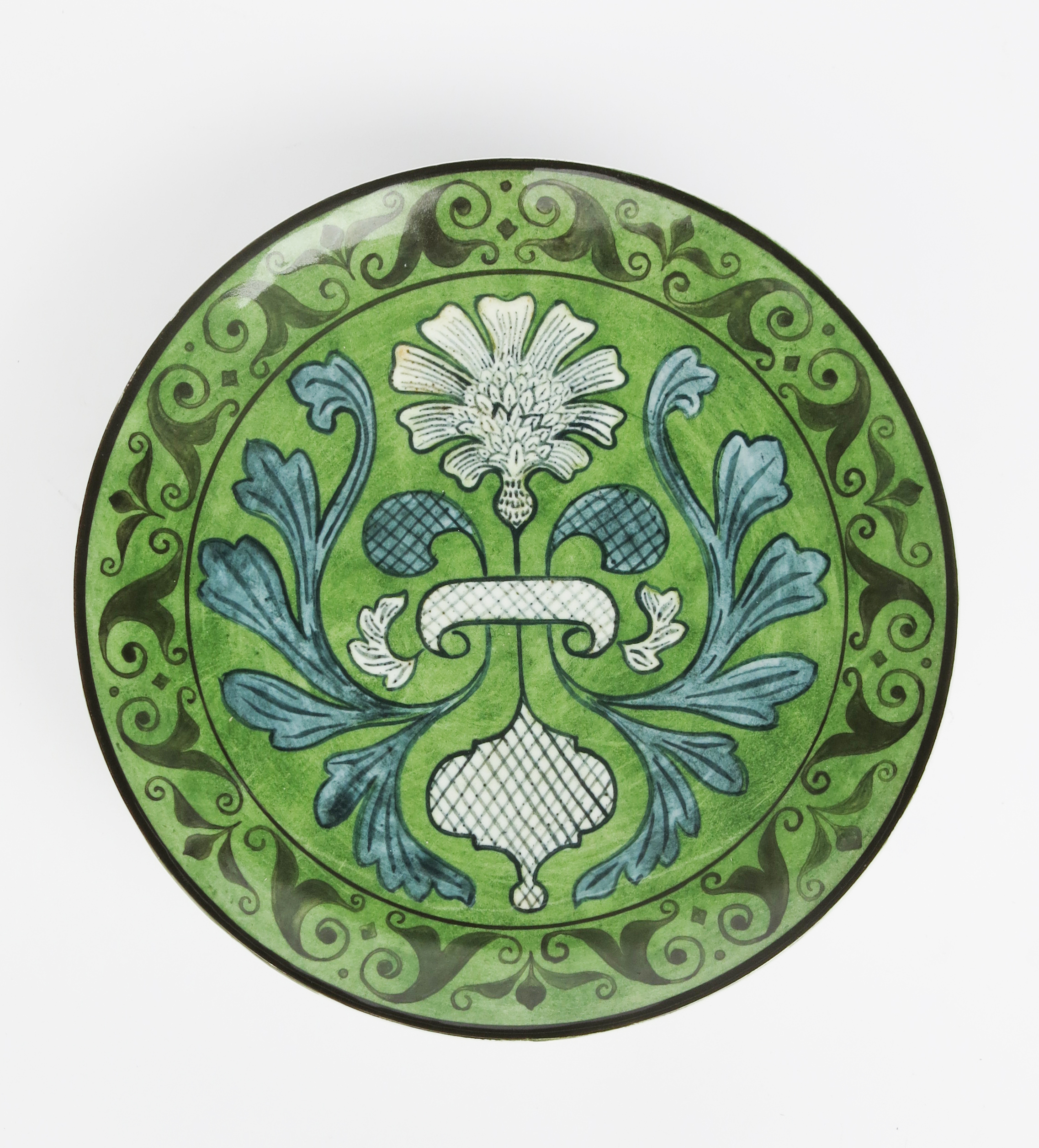An Arts and Crafts plate dated 1887, painted with stylised flowers and foliage in blue on a green ground, inside scroll border, painted marks, TC monogram June 1887, 23.5cm. diam.