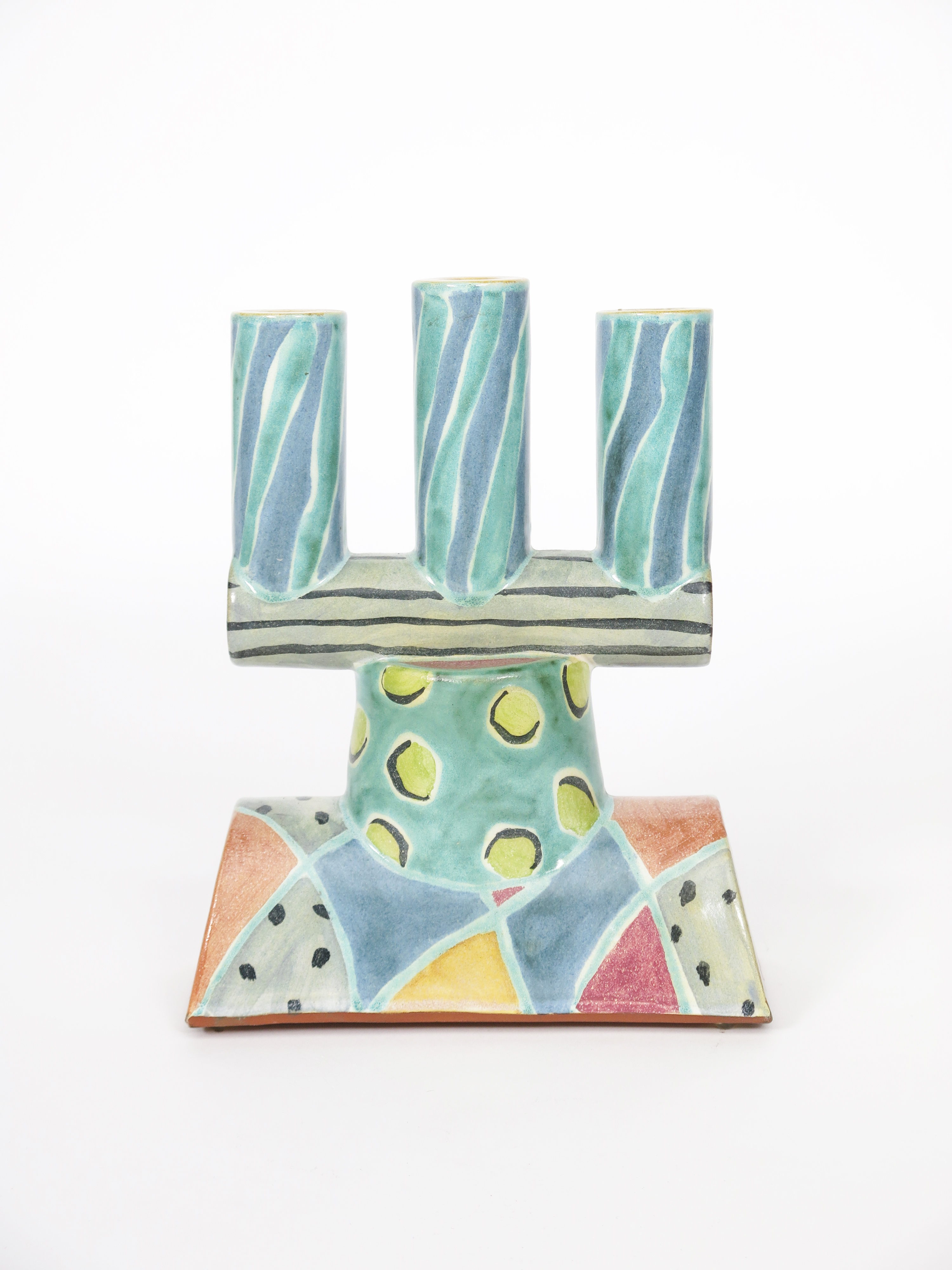 a Redware Pottery three branch candlestick, dated 1991, painted in colours painted T S Post 91 to base, 28.5cm. high