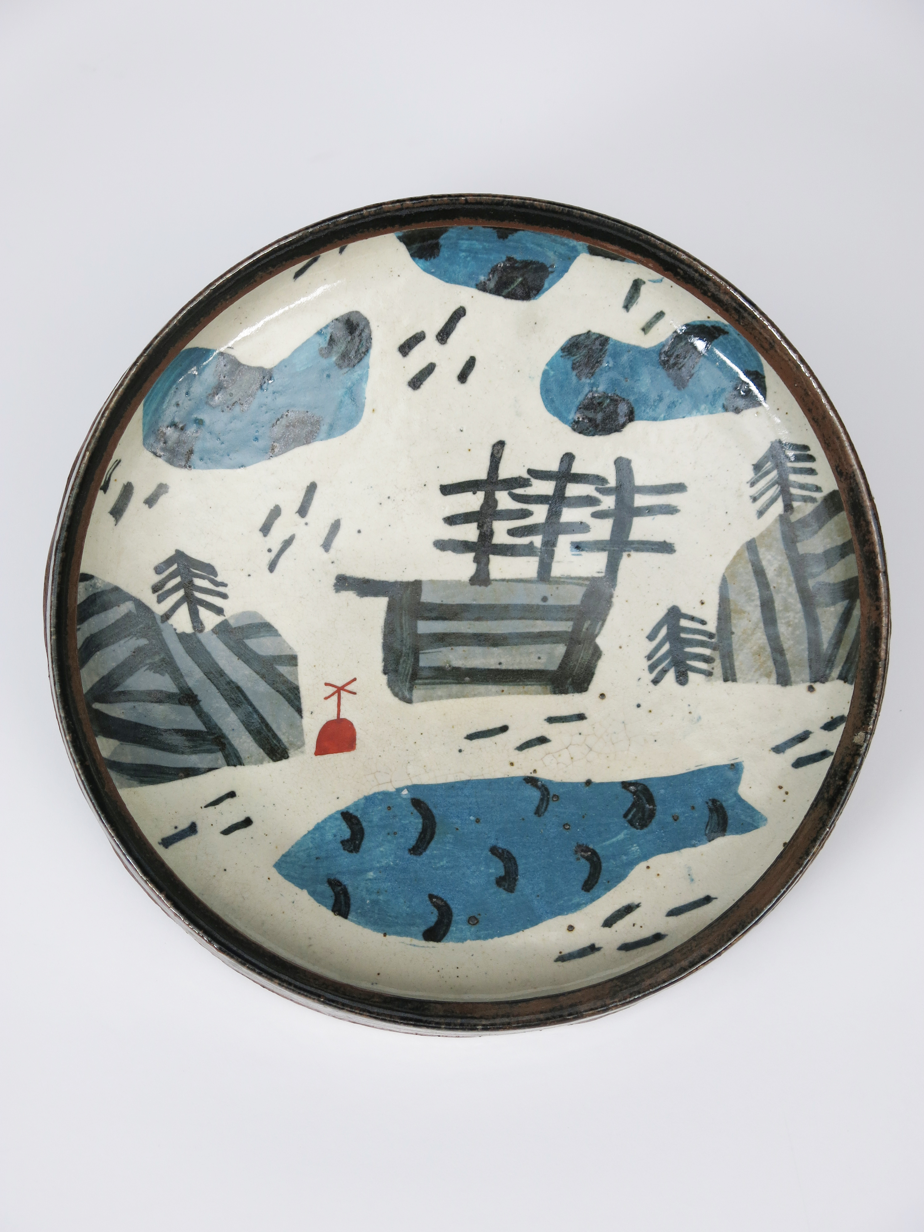a large stoneware bowl, with slightly inverted rim, painted to the well with a ship sailing past a buoy and headland, the foreground a large fish, all below rain clouds, in colours impressed seal mark, small glaze frit to rim and hairline, 28cm. diam.