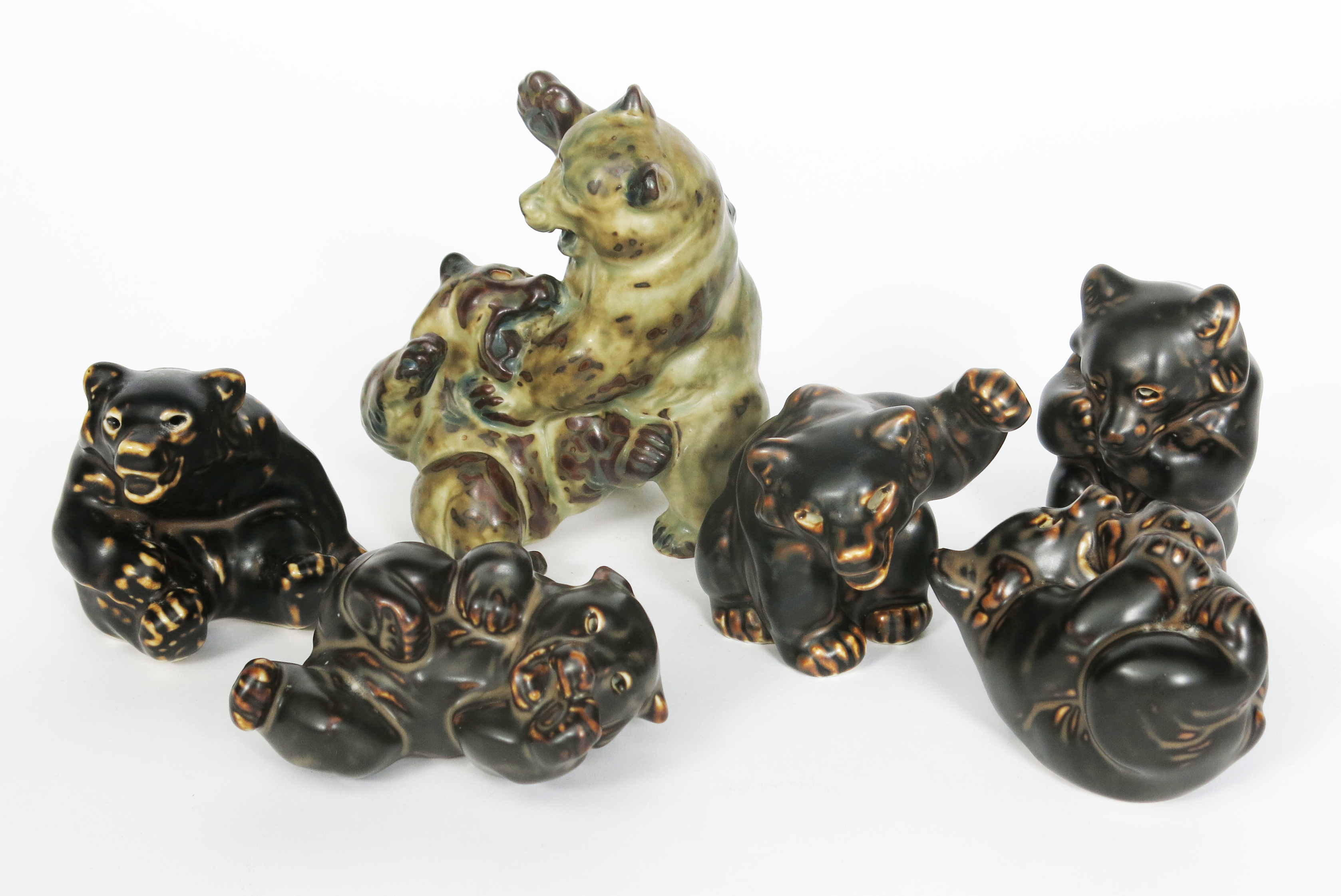 A Royal Copenhagen porcelain model of two bear cubs playing designed by Knud Kyhn, model no.20270, covered in a matt brown glaze, and five other Royal Copenhagen models of bear cubs glazed matt ochre, printed and painted marks, impressed artist cipher to main figure, 13cm. high (6)