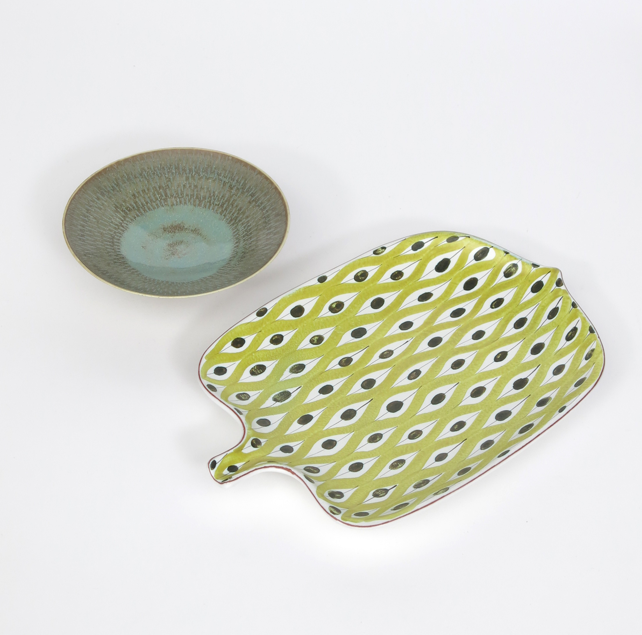 A Gustavsberg pottery leaf dish designed by Stig Lindberg, shaped rectangular form painted with geometric veined design in lime green, highlighted in black on a white ground, and a Gustavsberg shallow conical bowl by Stig Lindberg painted factory mark and Stig Lindberg hand mark, 30cm. wide. (2)