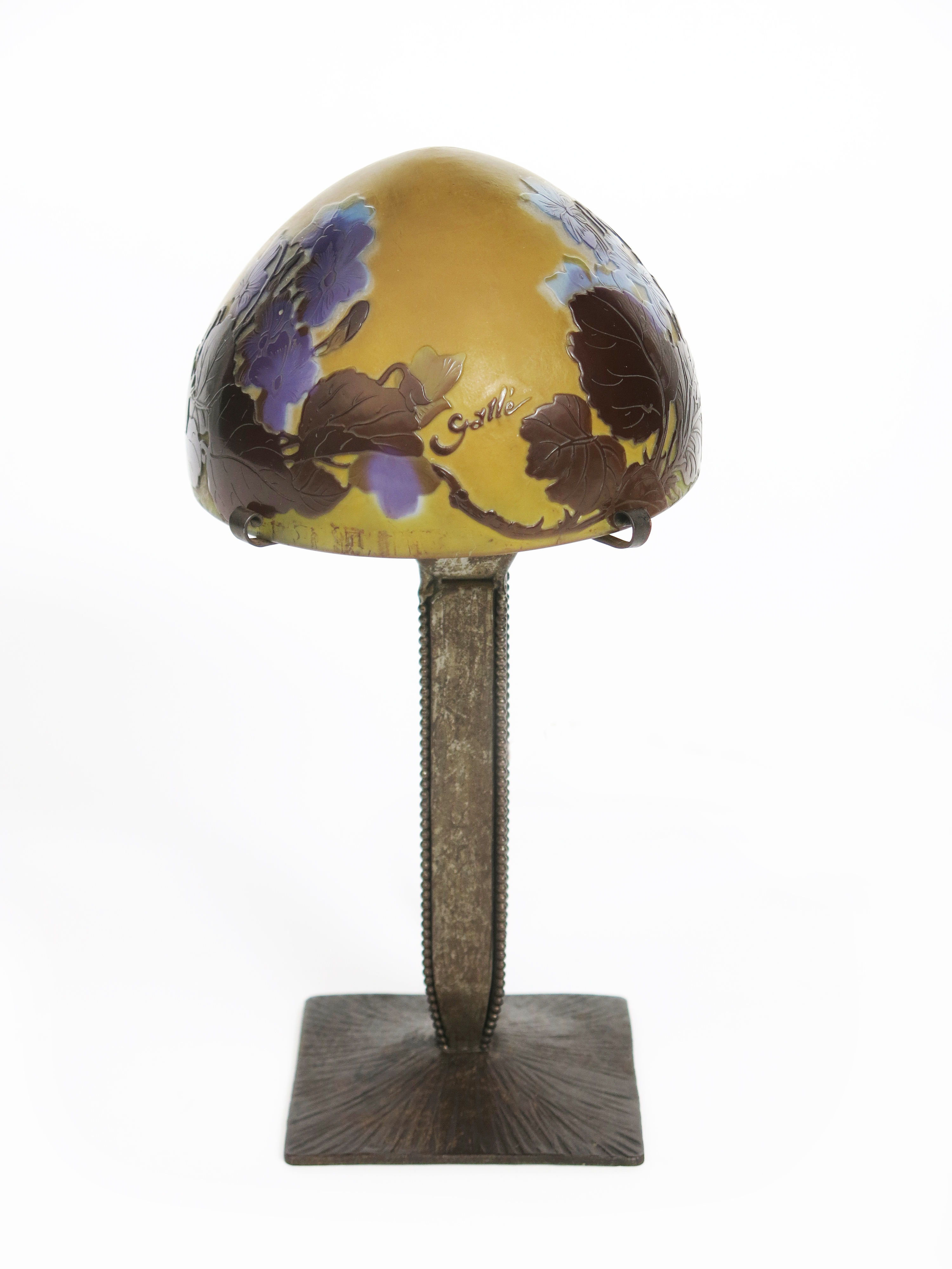 An Art Nouveau Galle cameo glass shade on patinated iron base, the base in the manner of Edgar Brandt, square section, with textured form and applied rope borders, the glass shade decorated with violet flowers cameo Galle signature to shade 26cm. high