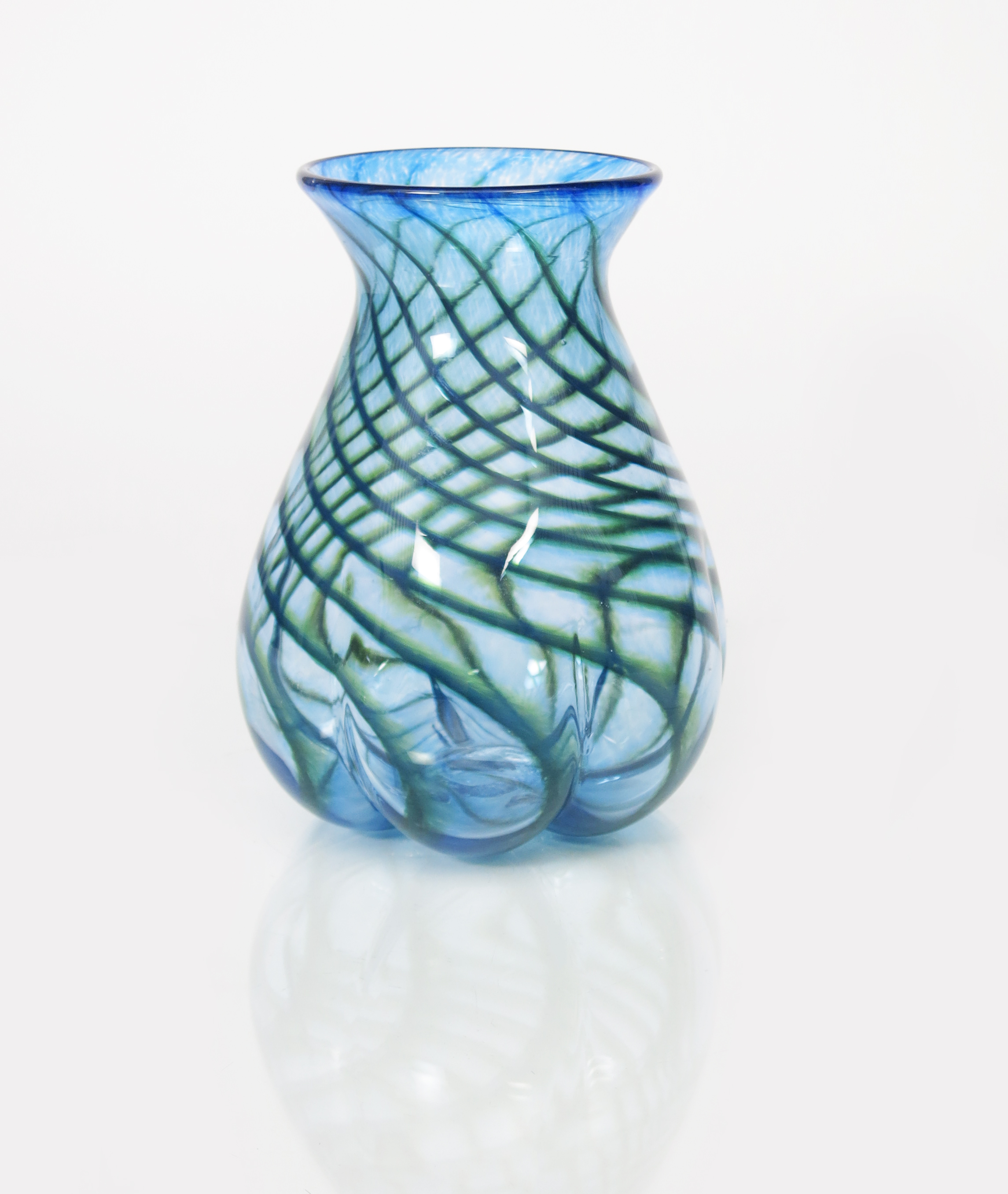 a bulbous stripy vase, green and blue stripes cased in clear etched signature, 22.5cm. high