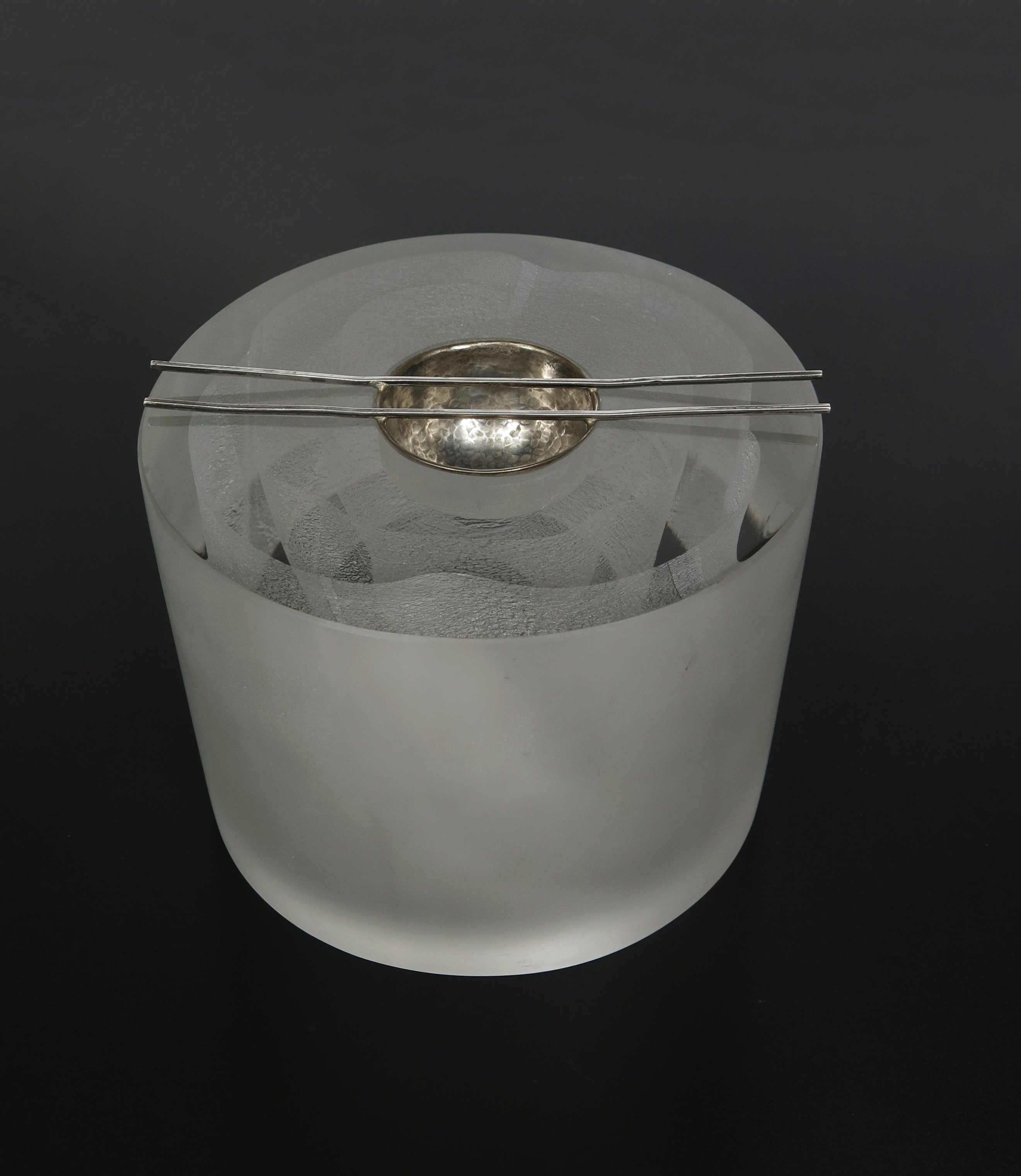A glass and silver sculpture by Laura diaz de Santillana, dated 1998 conceived in an edition of five, cylindrical drum form internally decorated with frosted waved vertical planes, the exterior frosted, the central aperture with silver bowl, etched signature, date and number 2/5, silver stamped 925, 12cm. high, (2)