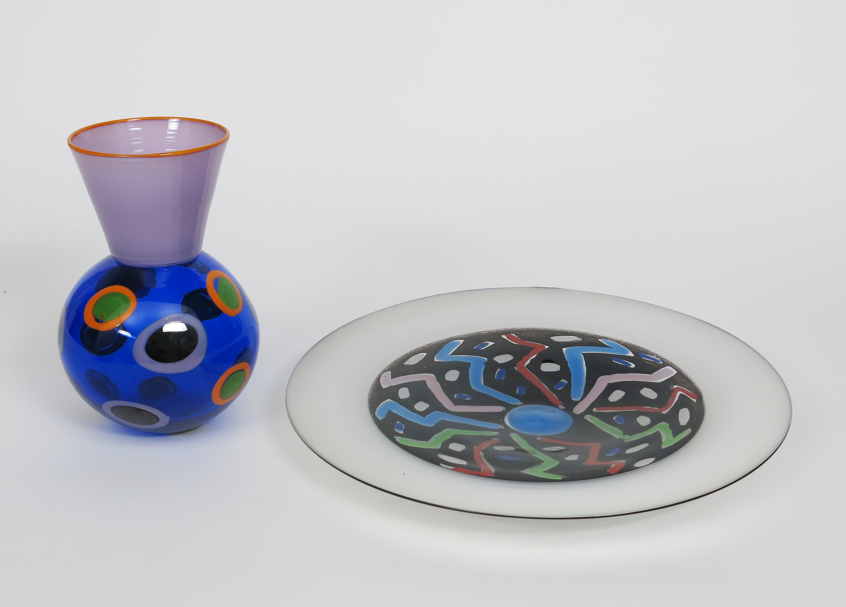 A glass vase by Simon Moore dated 1985, ovoid blue glass body with orange and purple circles, highlighted with green, with flaring purple neck and orange rim, and a glass charger by Simon Moore made at The Glasshouse in 1984, etched marks, 24.5cm. high