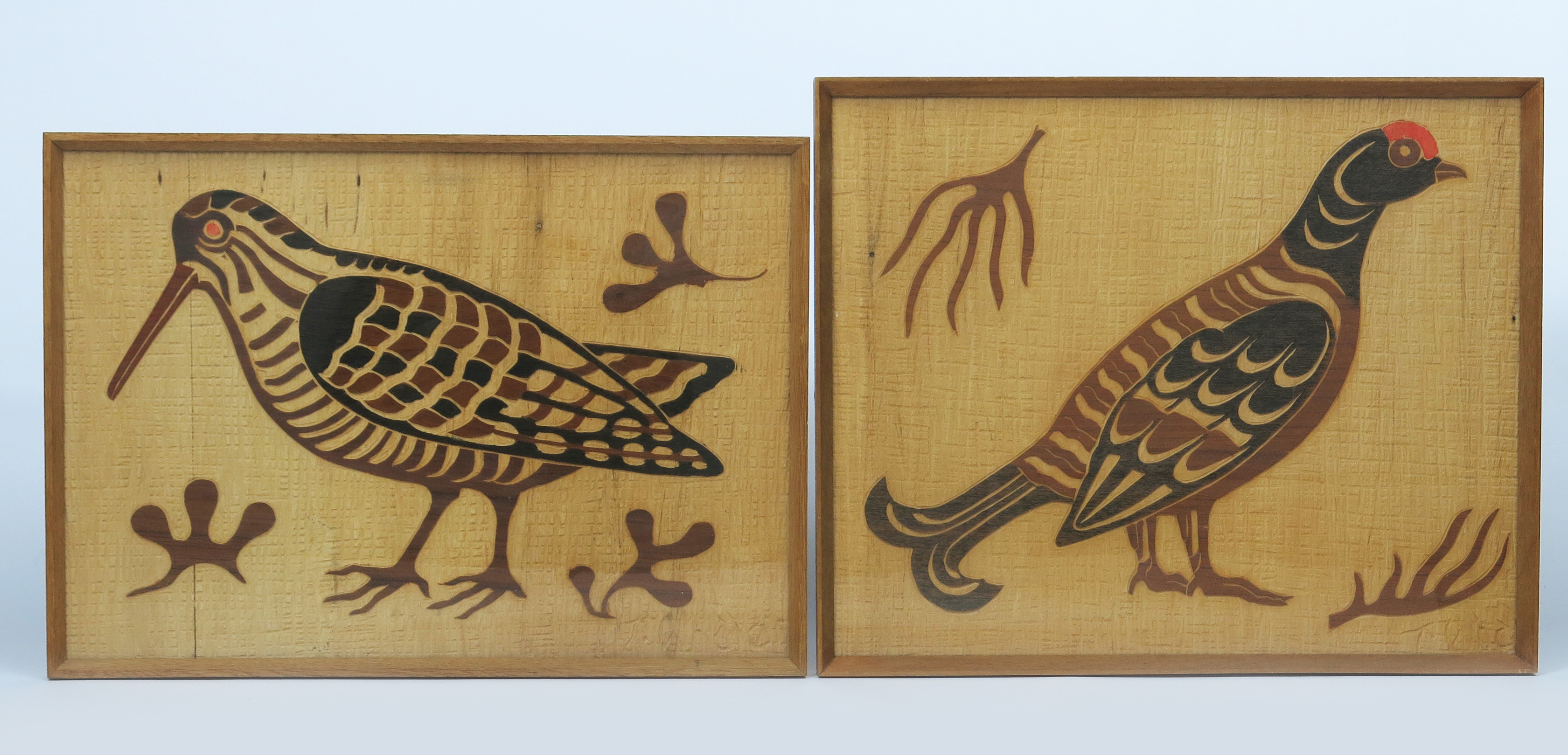 Thomas Whalen R.S.A (1903-1975) Woodcock and Grouse two carved spruce and teak wood panels with...