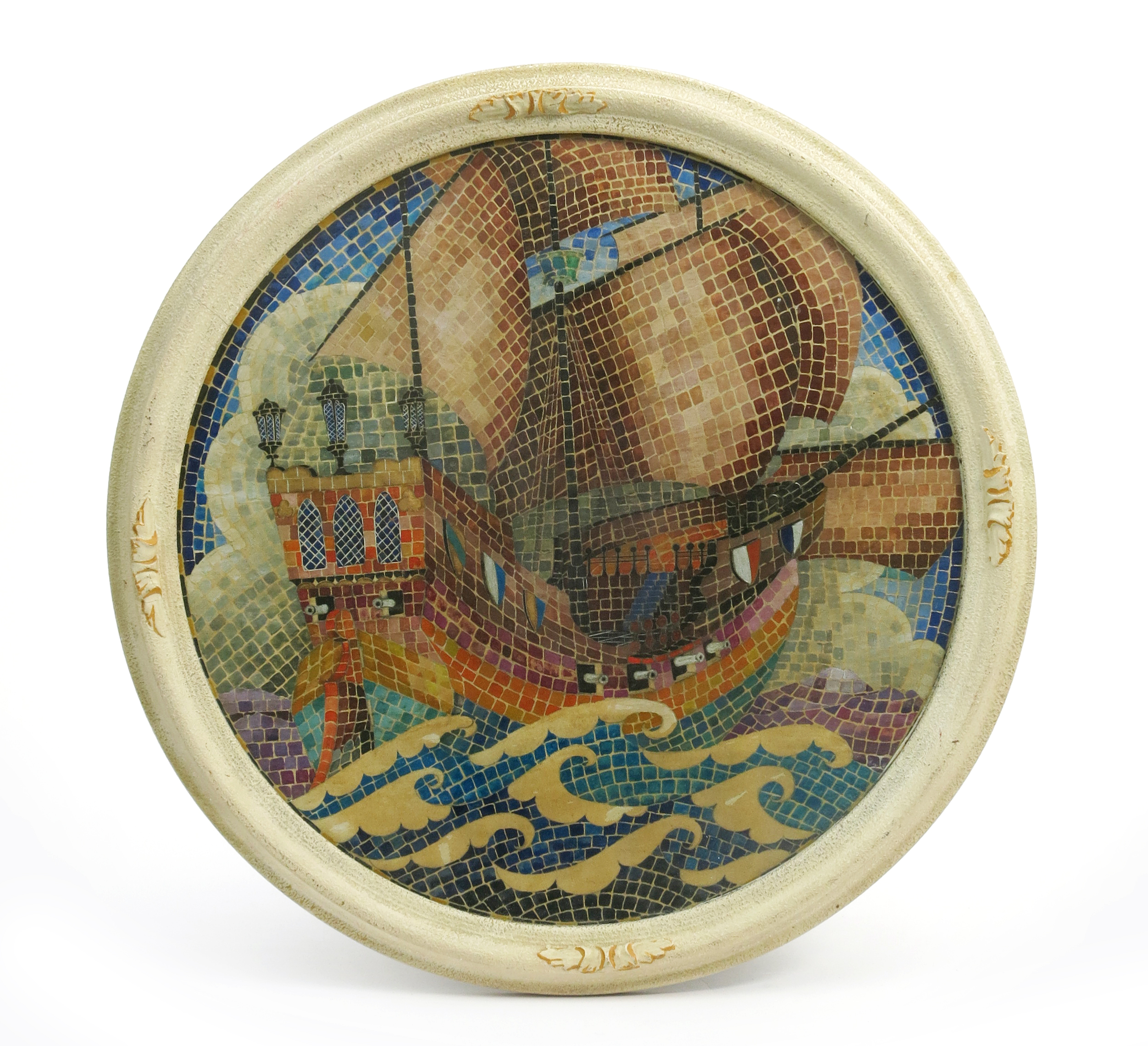A watercolour design of a Man O' War, circular, possibly designed for a mosaic, framed, unsigned, 44.5cm. diam. (image)