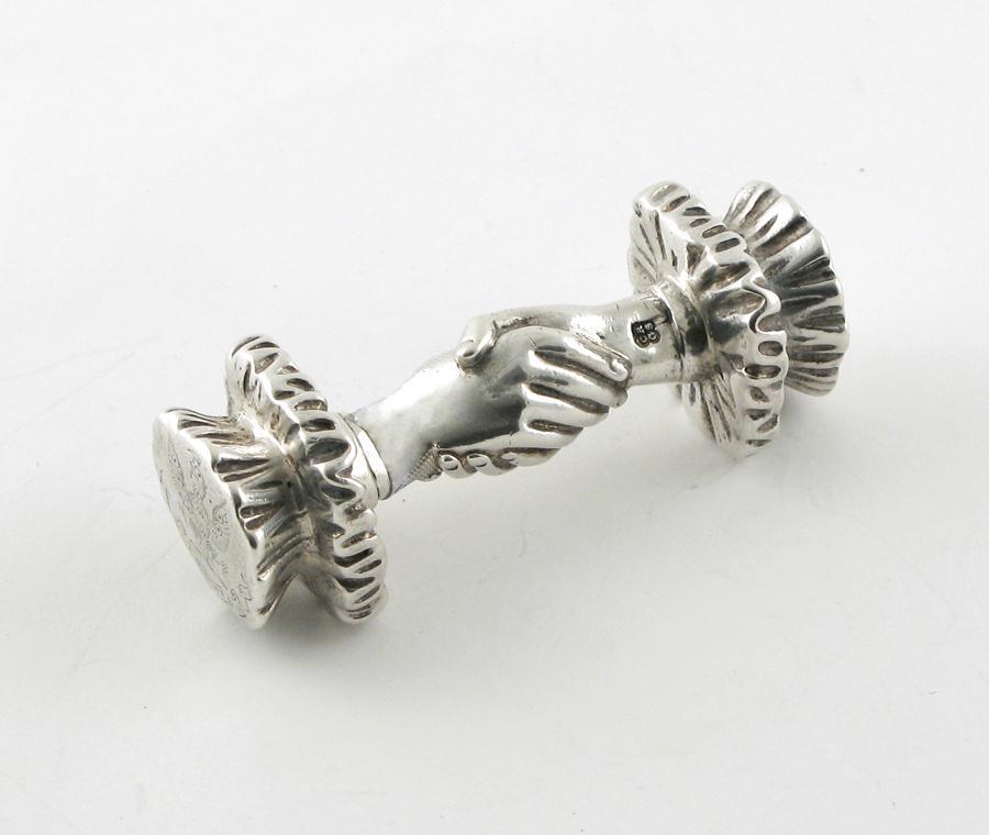 An unusual Victorian cast seal?, in the form of a 'handshake' the wrists with large frilly cuffs, one end initialled, the other with coat of arms, by C. Reily & G. Storer, London 1840, 3.45in (8.8cm) long, 5oz.