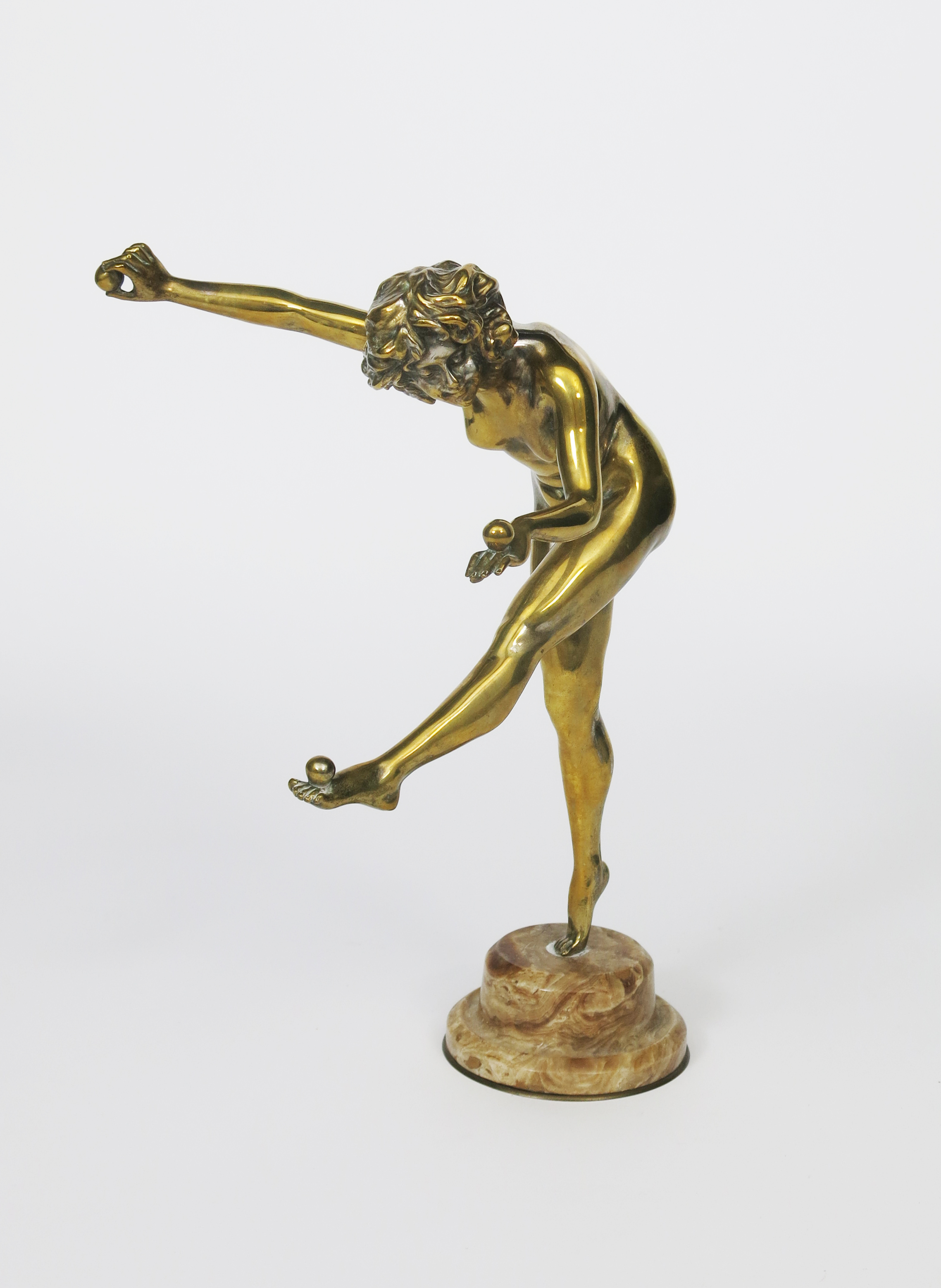 Claire Jeanne Colinet (1880-1950) The Juggler a polished bronze sculpture on domed brown...
